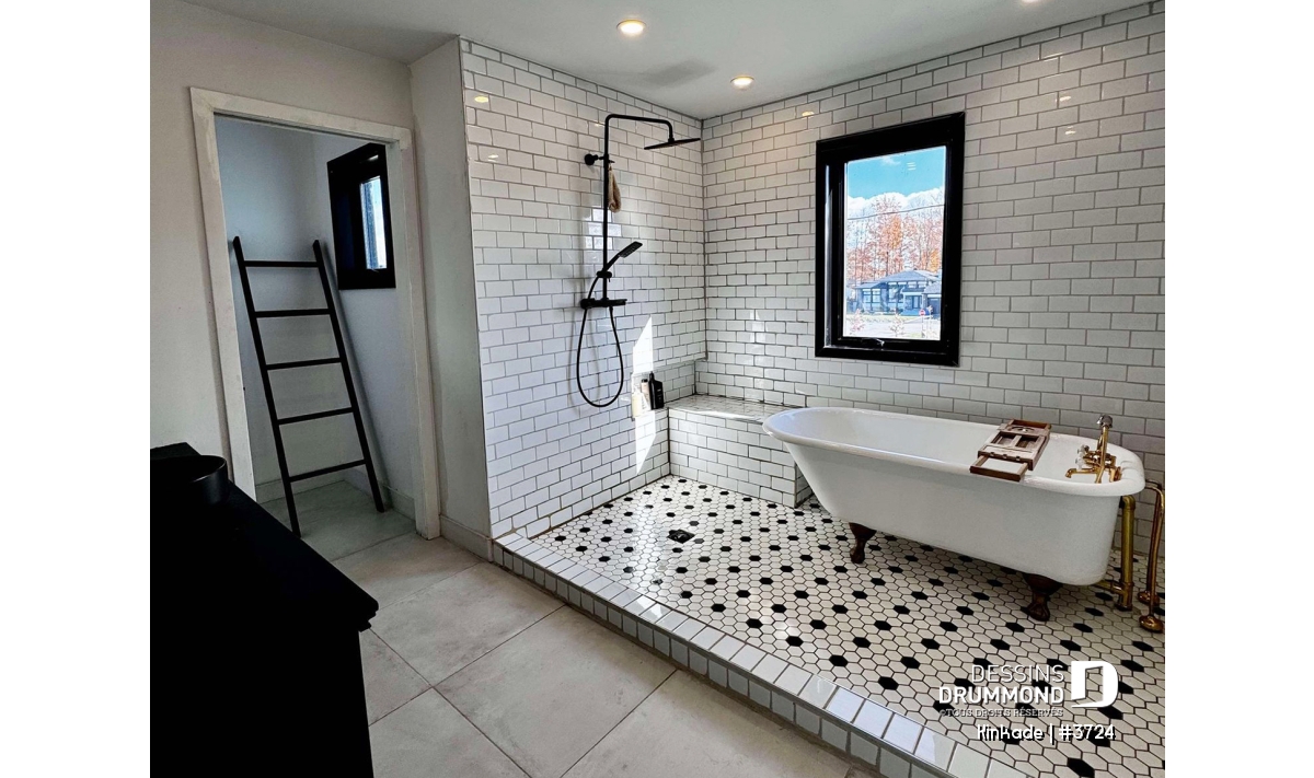 Salle de bain avec vanité double, toilette privative en cabine, bain et douche séparés.