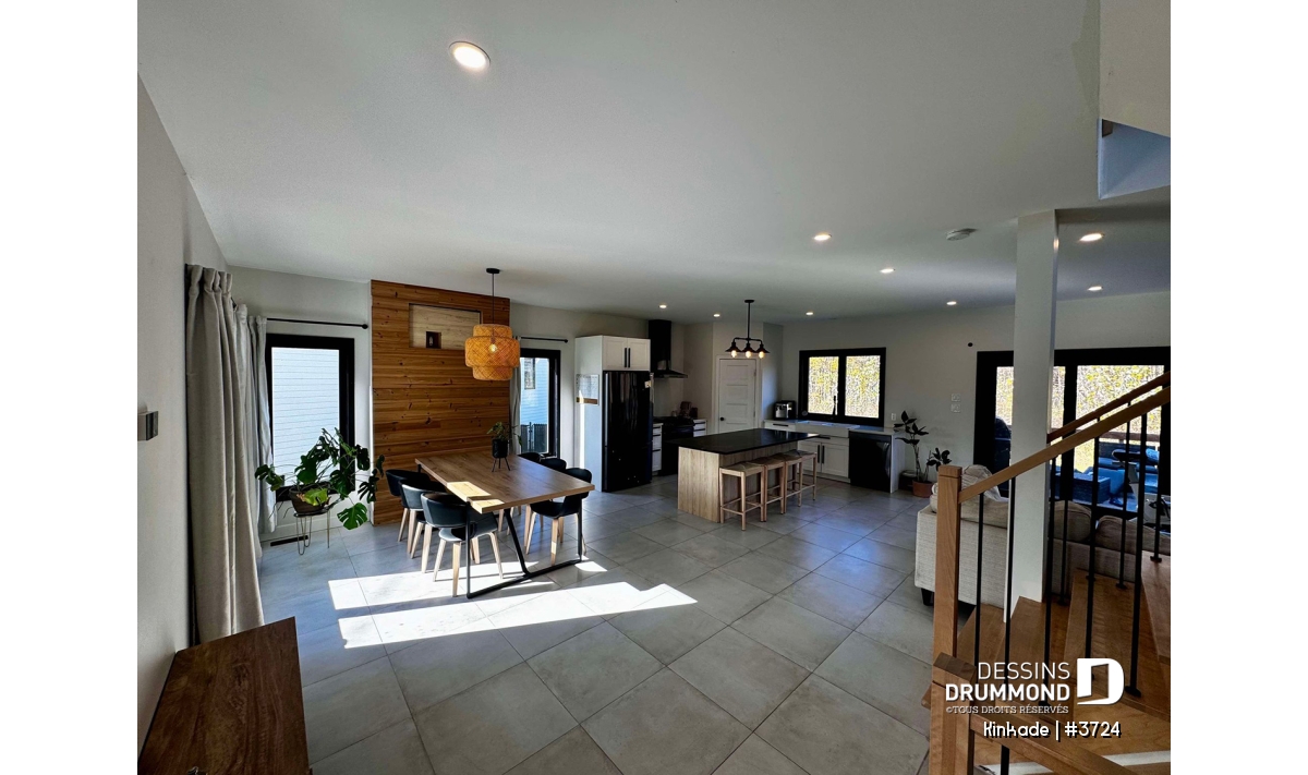 La salle à manger est de grand format et peut recevoir une table d'au moins 8 convives, voire même 10. Elle est ouverte sur la cuisine. Cette dernière propose un grand îlot pour 4 personnes et un garde-manger de type walk-in. La salle de séjour (salon ou salle de télé) est aussi ouverte sur la cuisine, permettant des communications rapides avec le reste de la famille pendant la préparation des repas. De plus, des portes patio triples et deux fenêtres amènent beaucoup de lumière naturelle à cette pièce.