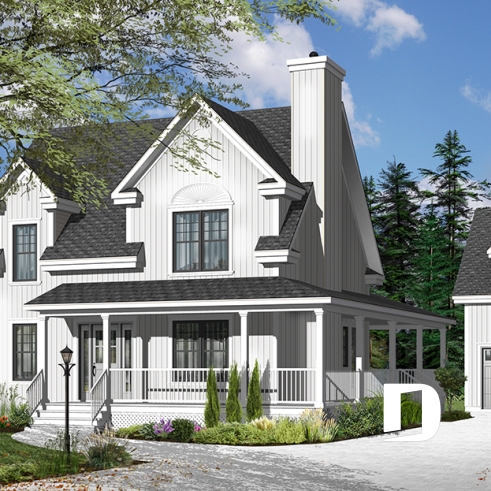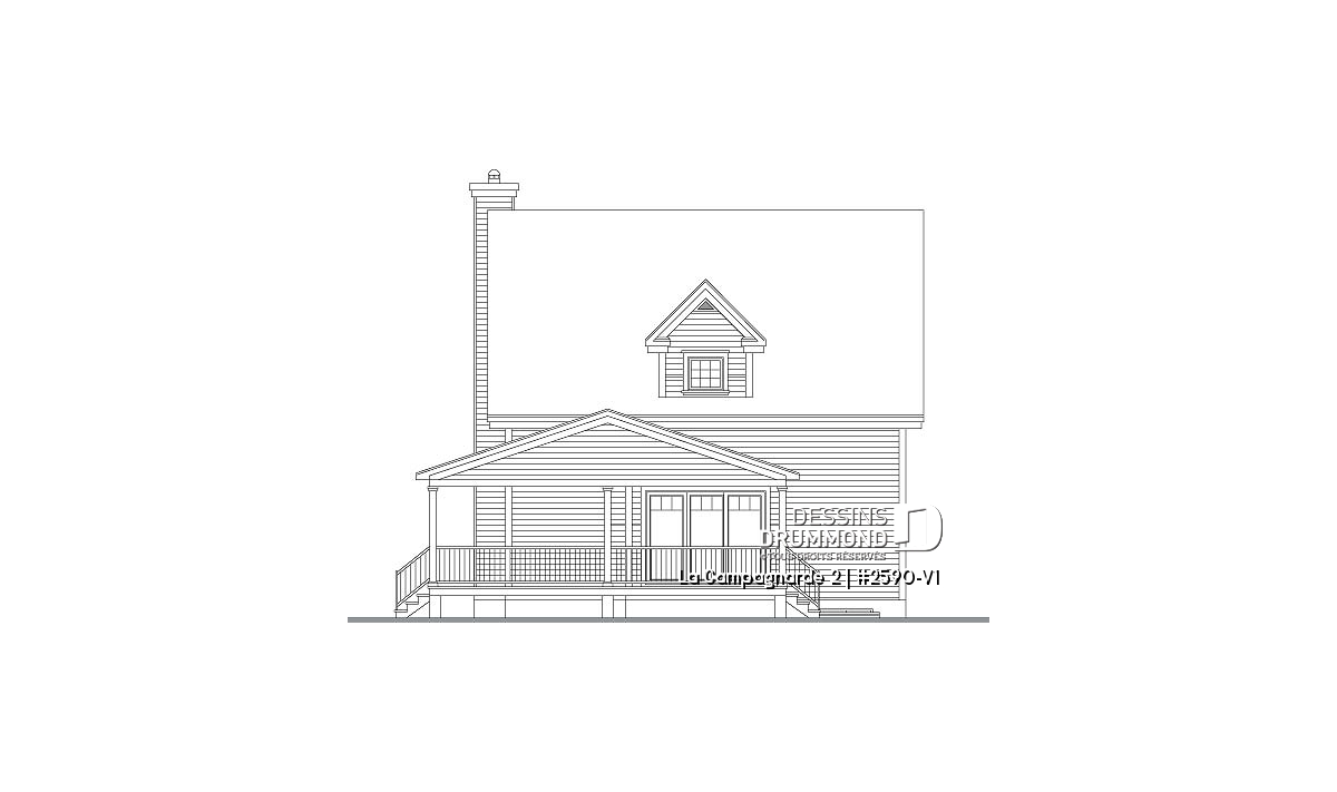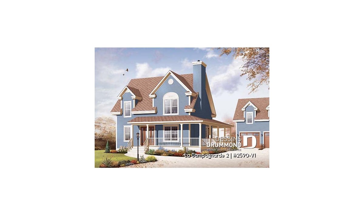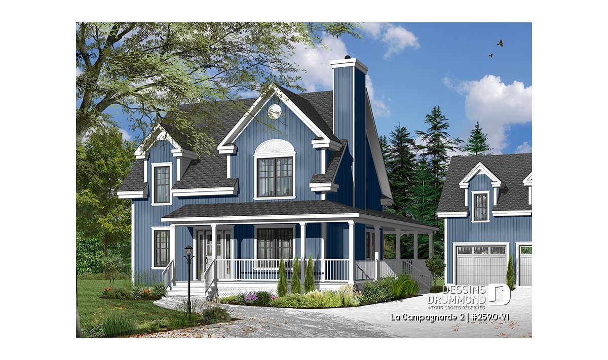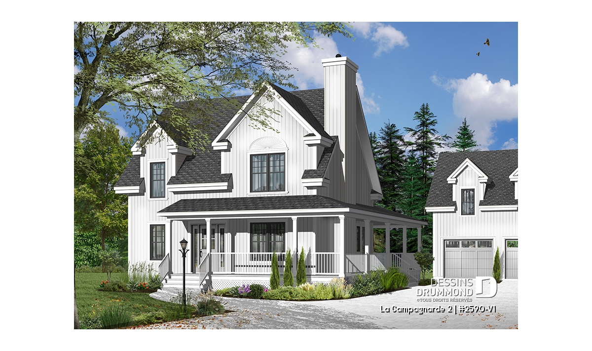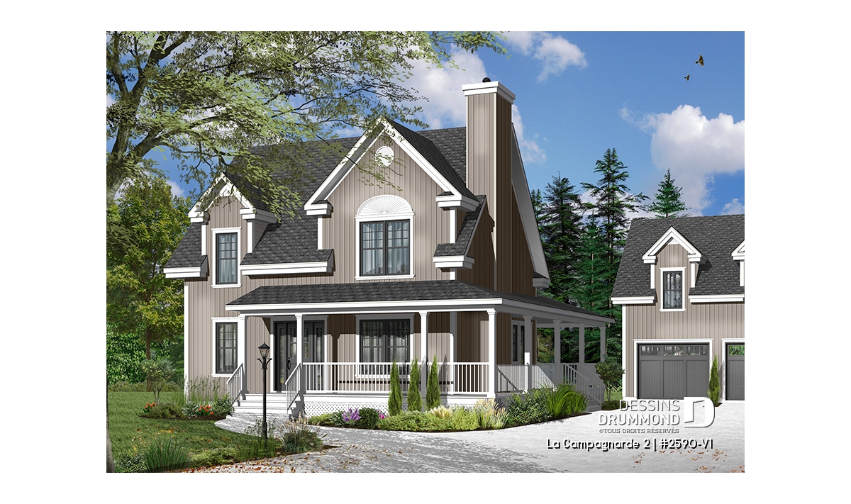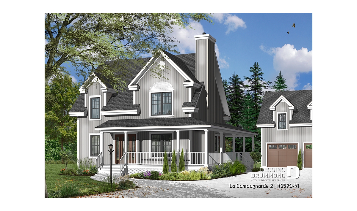 Loin de vouloir remettre tout en question sur le plan original 2590, cette approche version permet de voir cette maison d’une différente façon. D’abord par l’inversion du modèle d’origine, par l’addition d’un foyer à la salle de séjour et celle d’une salle de bain à l’étage. Ensuite, par le biais de cette belle galerie couverte se prolongeant sur l’arrière de la maison et créant, au coin arrière-droit, un très bel espace couvert pour y manger à l’abri des intempéries. De plus, on doit souligner cette proposition d’un garage double détaché, le plan 2999, très logeable, fort bien marié à la maison et qu’il vous est aussi possible de commander.