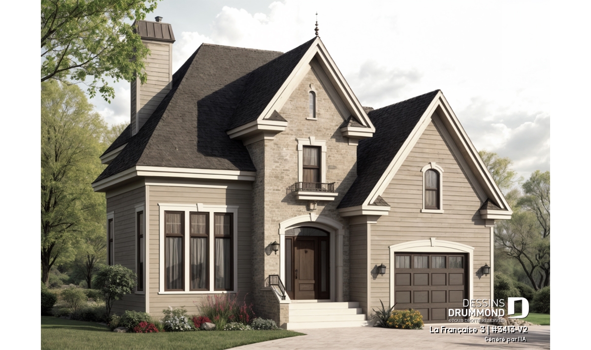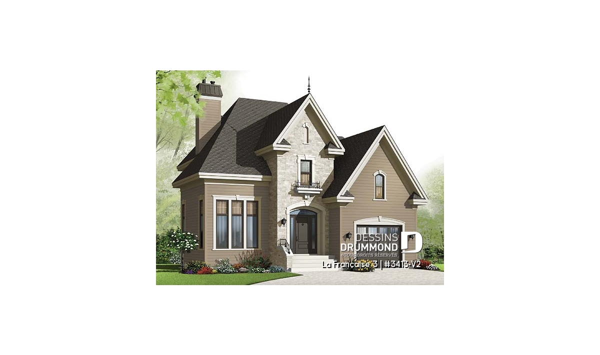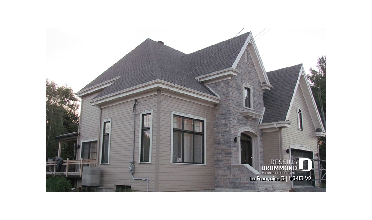 Heureux compromis entre le modèle d’origine 3413 et sa première version agrandie 3413-V1, ce plan se veut fort intéressant par le fait qu’il propose presque autant de pi2 que le 3413-V1 à un budget quasi équivalent au 3413 de base. Un heureux compromis que l’on doit à une simplification du volume arrière et surtout à l’utilisation de matériaux moins coûteux ( déclin en remplacement de la brique et de l’enduit acrylique ) en partie à l’avant et sur toutes les autres façades.