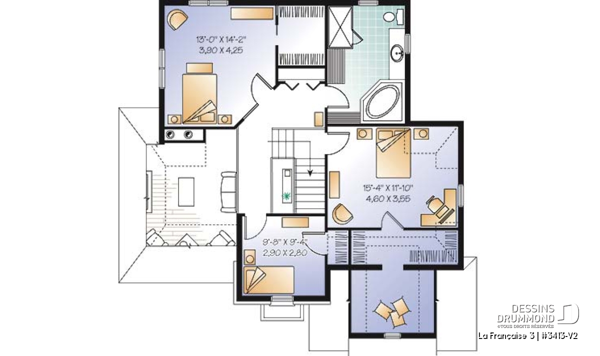 À l’intérieur, ce gain en pi2, par rapport au 3413 d’origine, se traduit par l’obtention d’un secteur cuisine-salle à manger plus confortable au rez-de-chaussée et par une suite des maîtres et une salle de bain encore plus logeable à l’étage alors que, du côté garage, on constate un gain de tout près de 75pi2 et l’addition, comme tant apprécié, d’une descente vers le sous-sol.