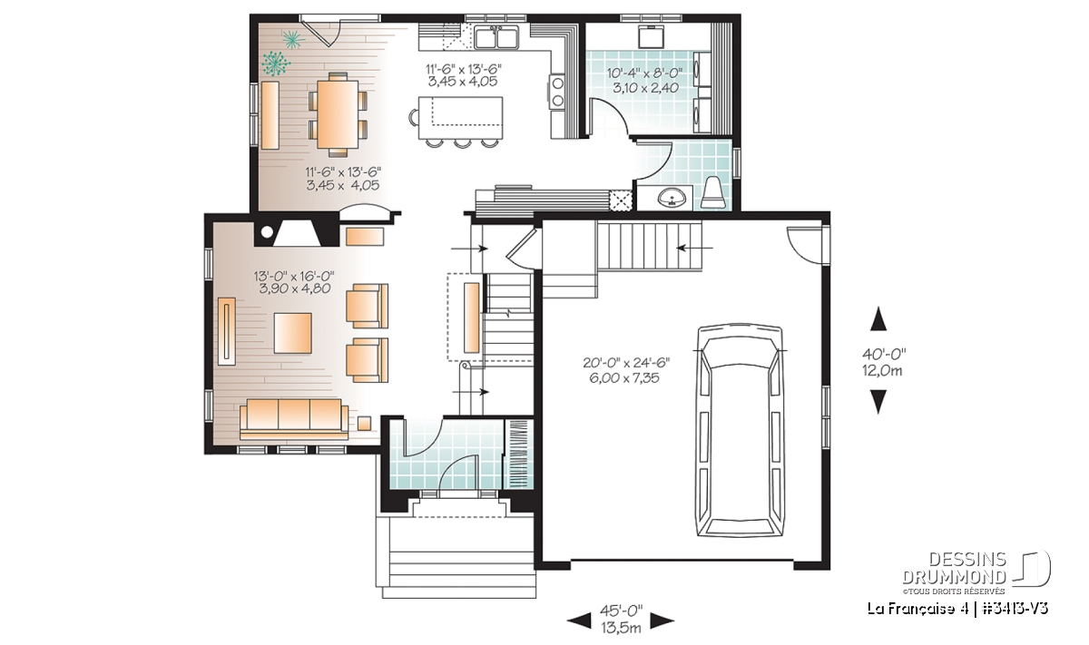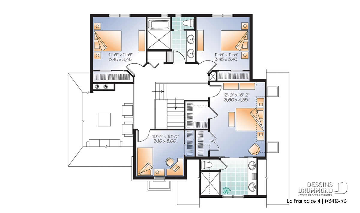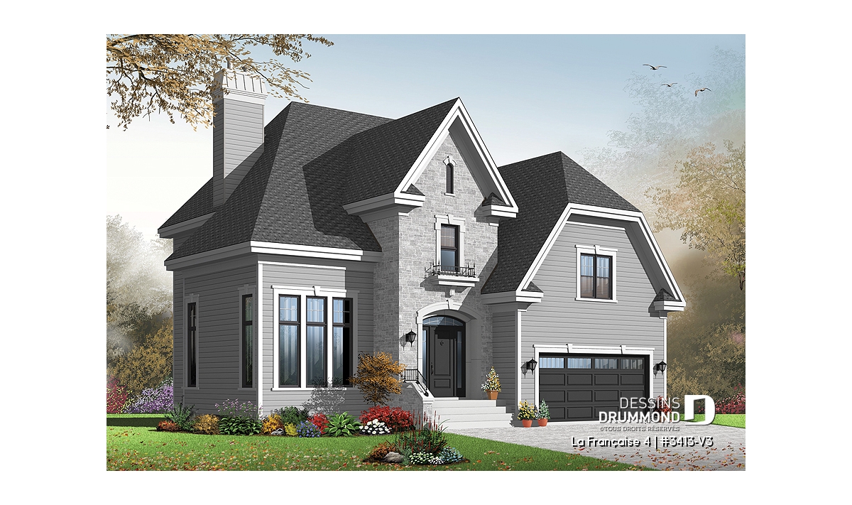 Réalisé à partir du plan similaire 3413-V2, ce plan 3413-V3 se veut encore plus imposant avec son garage double et d’autant plus confortable avec l’addition d’une 4è chambre à l’étage dont une suite des maîtres remarquable aménagée au-dessus du garage. Entrons donc sans plus tarder!