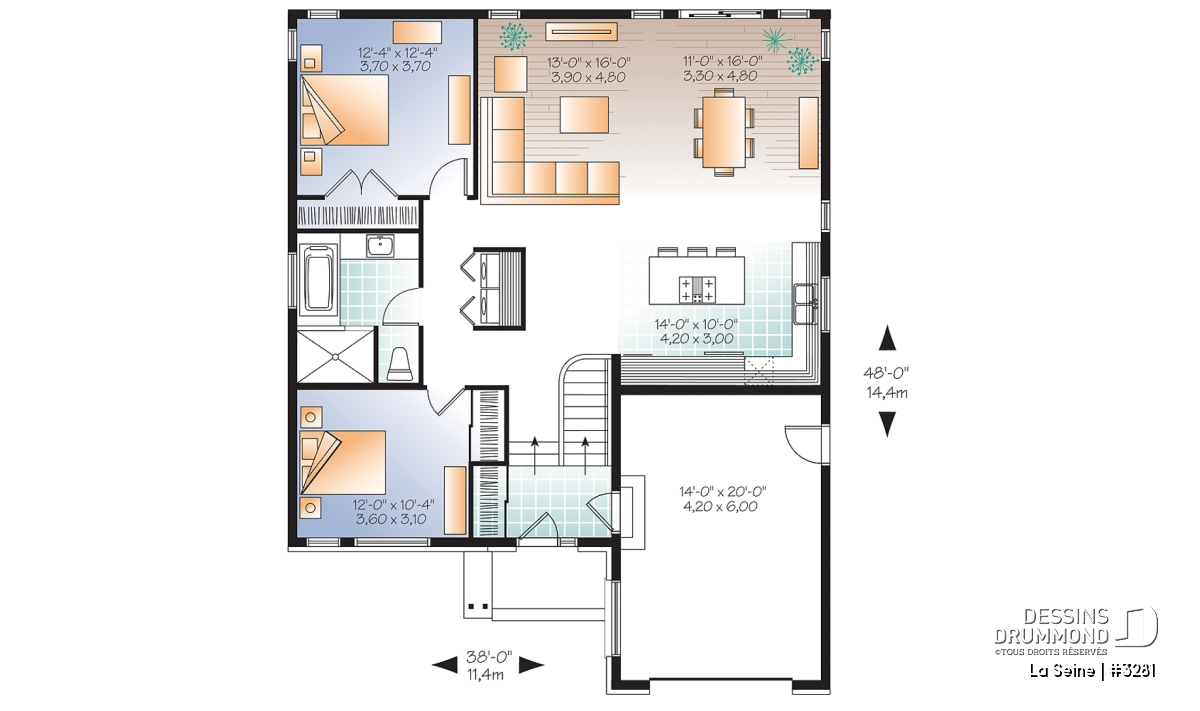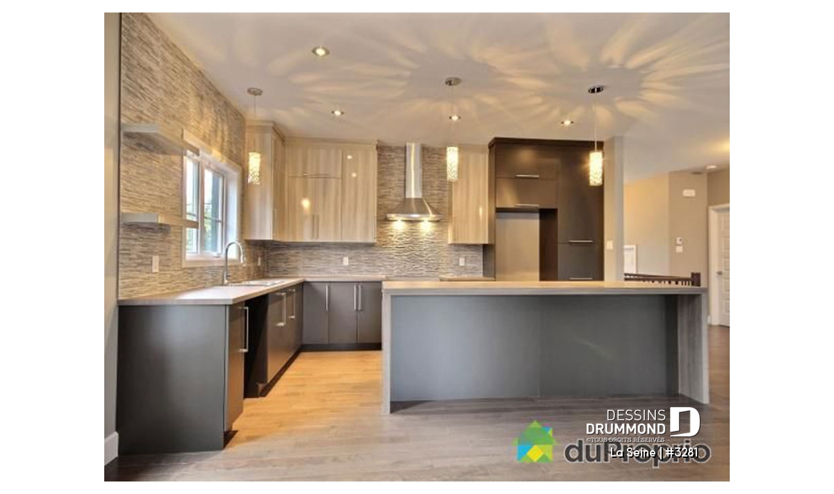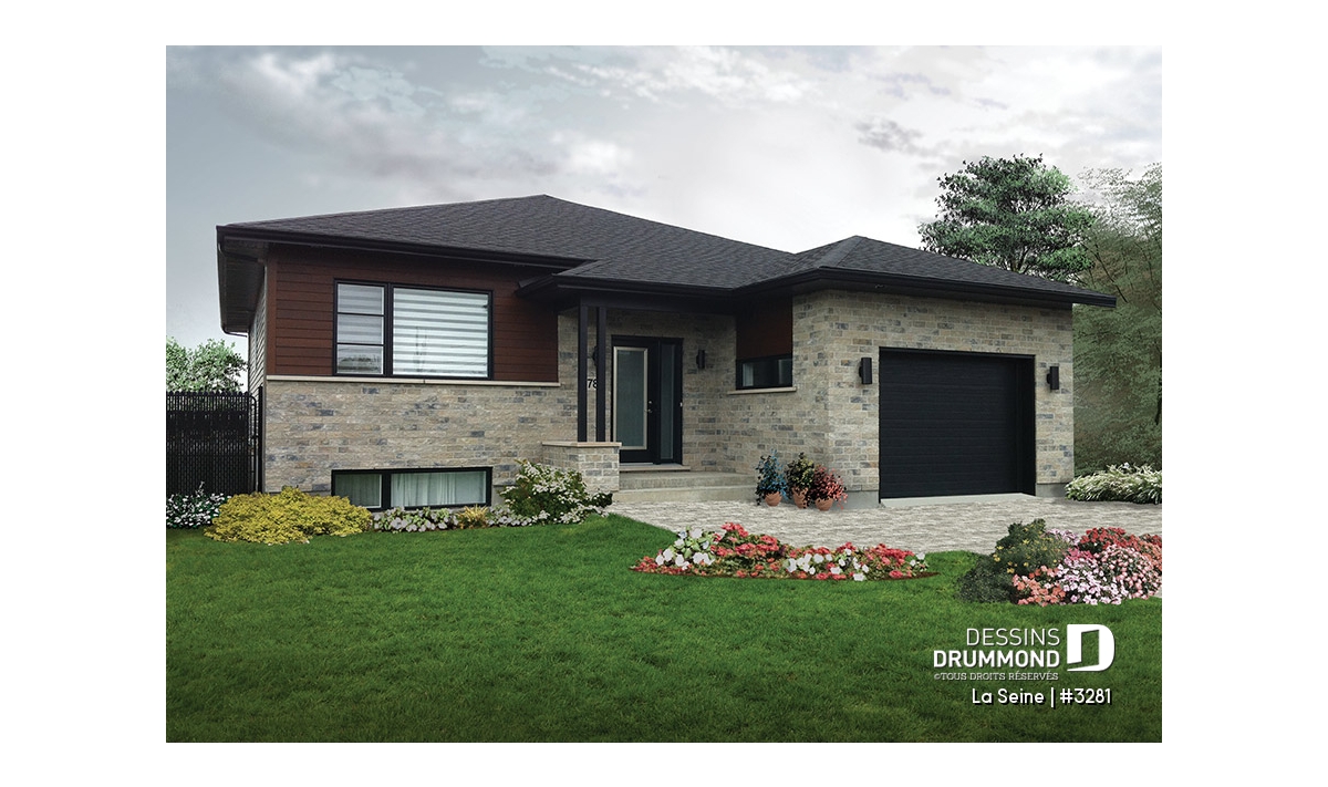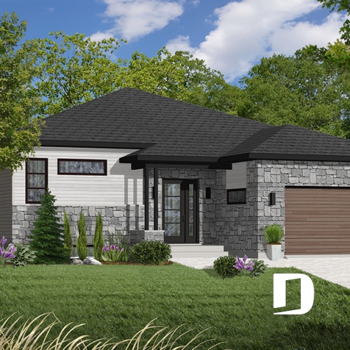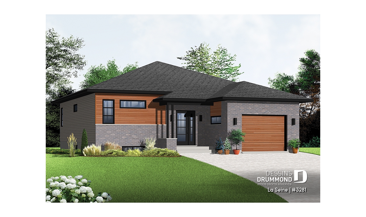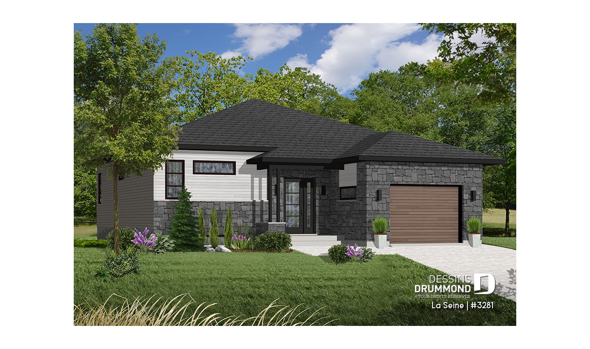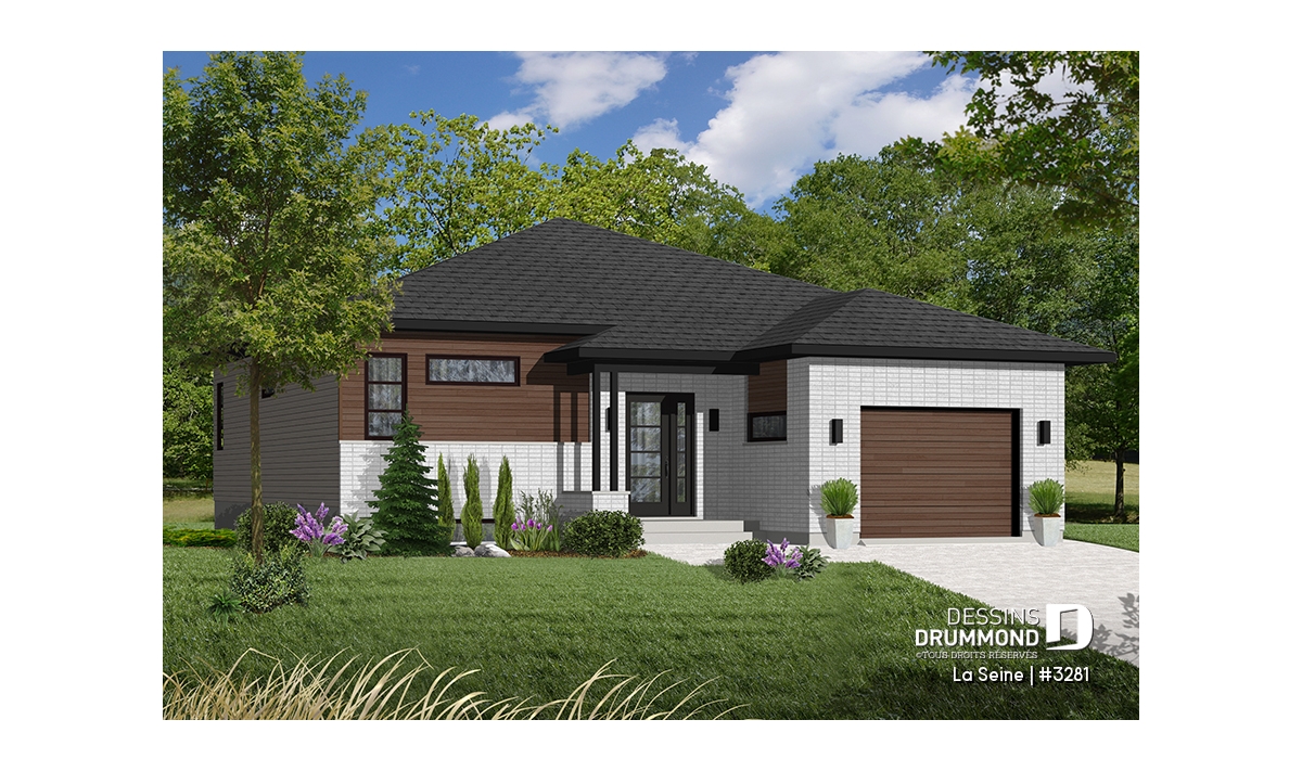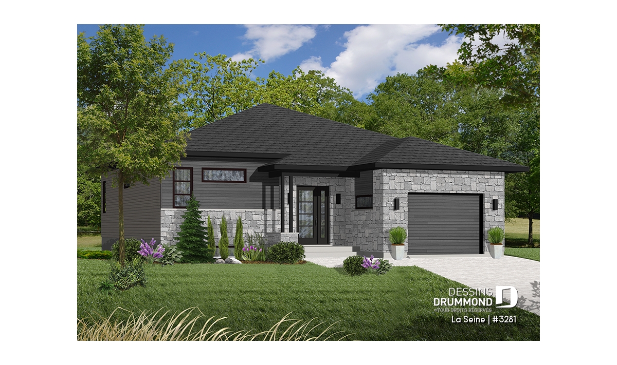 Suite à un sondage réalisé auprès de 450 répondants et proposant 3 intérieurs différents que les internautes intéressés avaient aussi le loisir de commenter, Dessins Drummond a mis de l’avant deux plans de plain-pied contemporain avec les deux intérieurs ayant suscité le plus d’intérêt ou reçu le plus de votes. Voici donc le 3281 faisant 38pi de largeur par 48pi de profondeur avec garage bien intégré de 14pi x 20pi intérieur et toiture simplifiée.