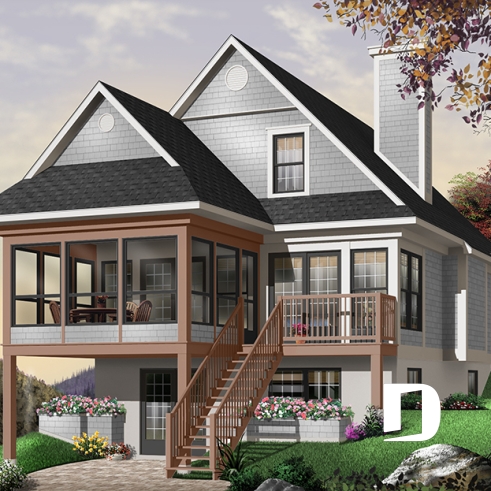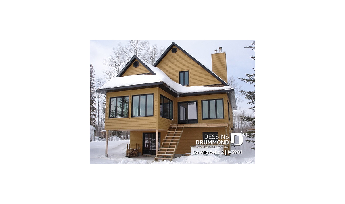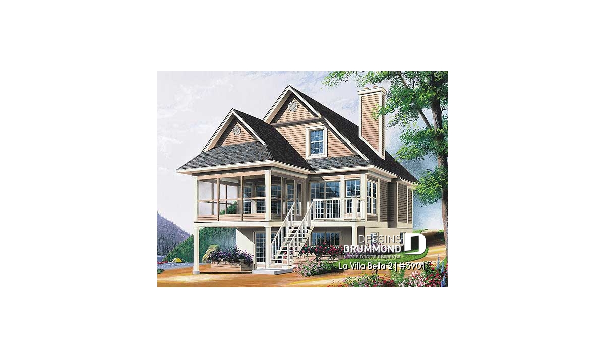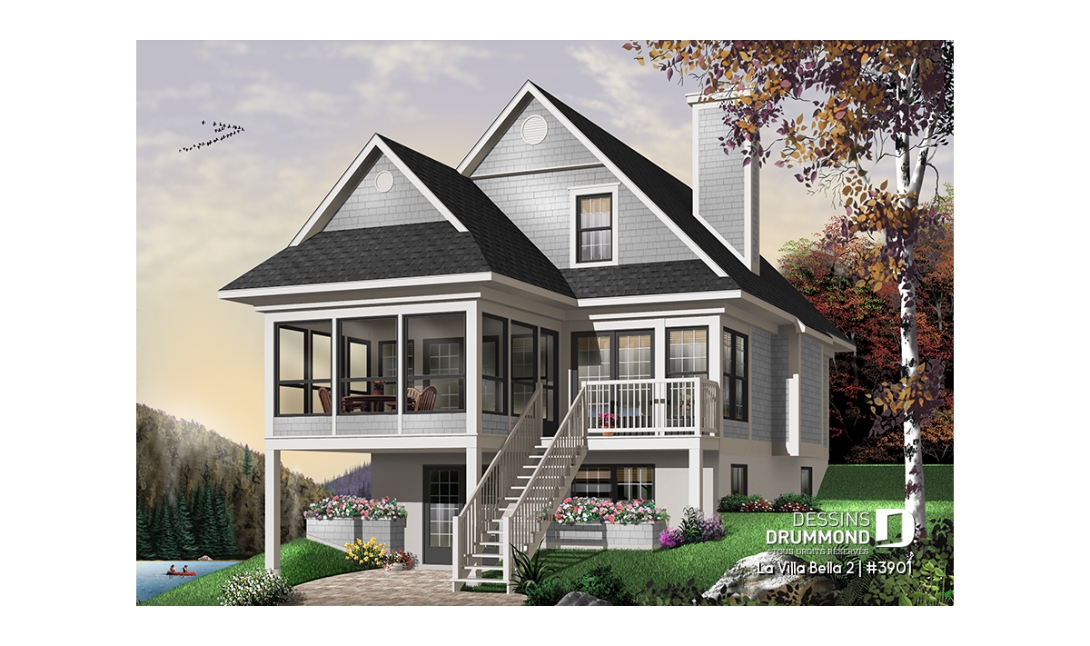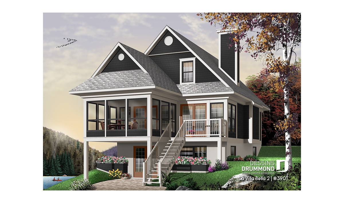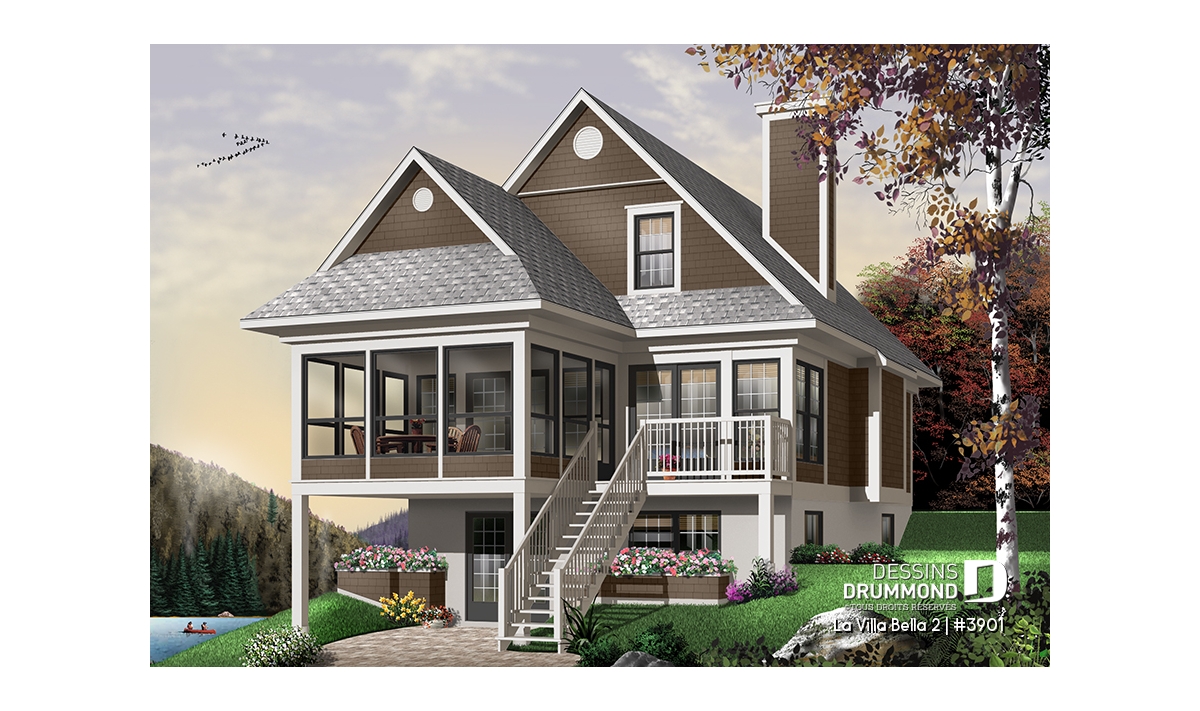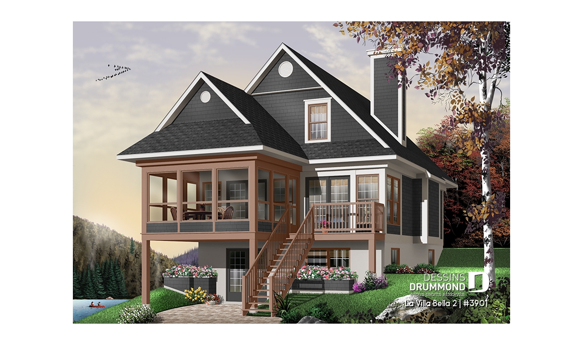 Plan de chalet 4-saisons offrant abri moustiquaire, 3 chambres, vue panoramique & espace ouvert