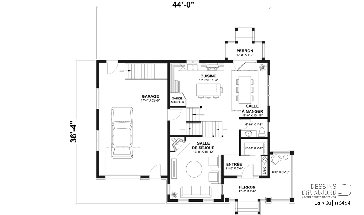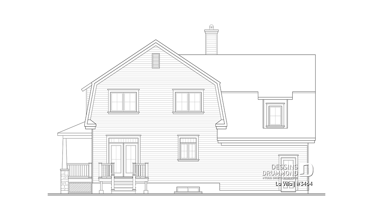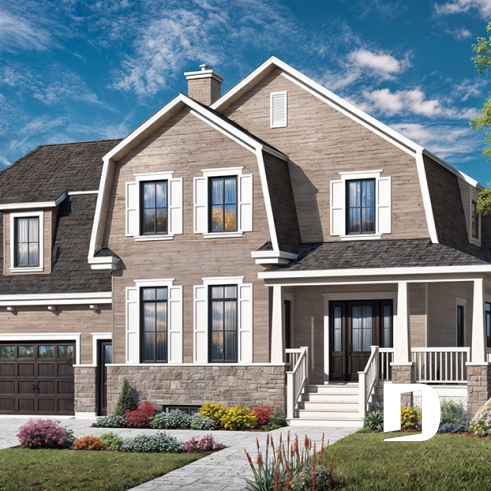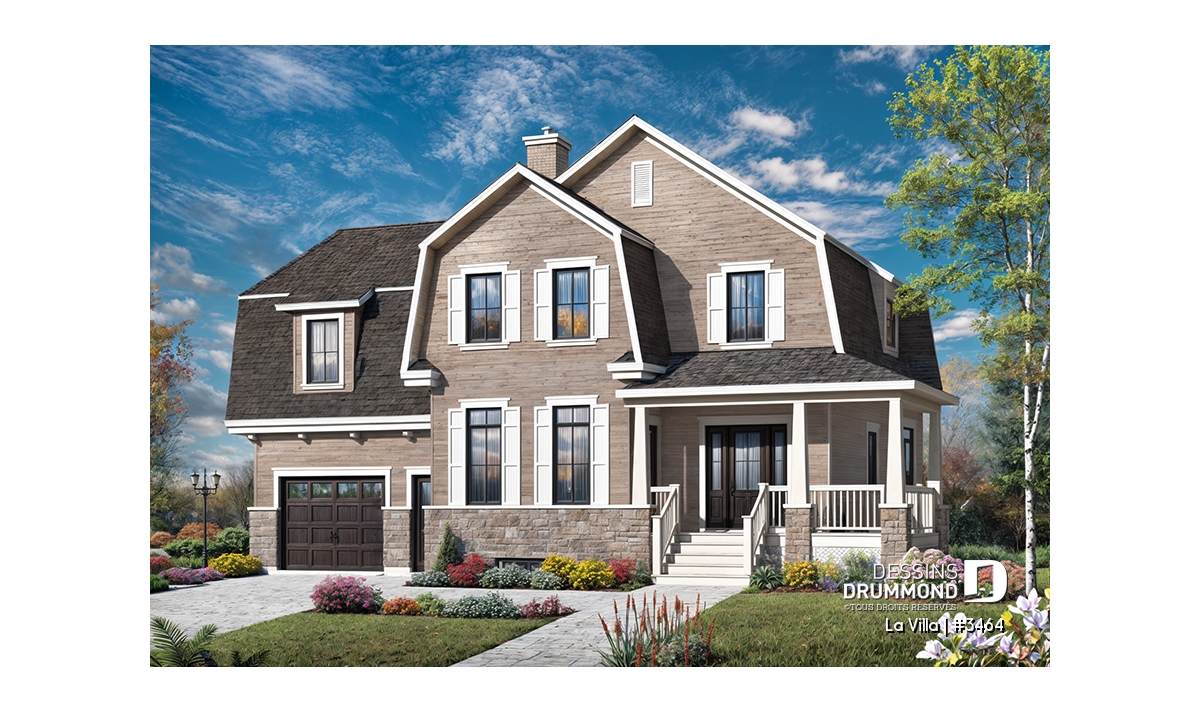 > Le plan de maison LA VILLA (plan #3464) propose 2297 pi.ca. aménagés sur 2 étages, excluant le sous-sol qui n'est pas aménagé. Dans le but de combler les besoins en chambres de certaines familles, comme celles reconstituées, Dessins Drummond propose ici un modèle mansardé fort logeable pour lequel on assiste à un bien heureux mariage d’un garage de 17’4'' x 28’8'' à une maison bien aménagée pour une grande famille. Sans oublier cette galerie couverte, en façade principale, qui procure une touche bien invitante à l’ensemble.