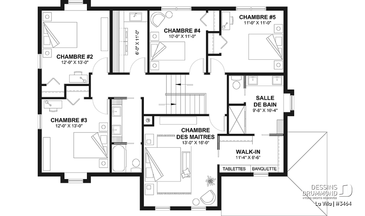 Cinq chambres à coucher prévues à l'étage dont une suite des maîtres avec garde-robe "walk-in" et salle de bain privée.