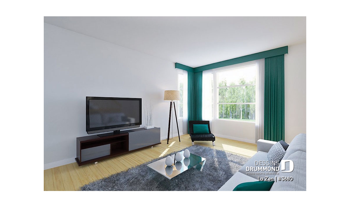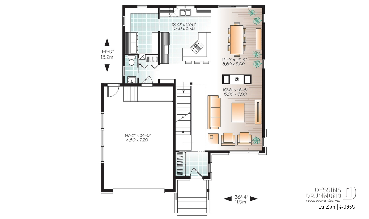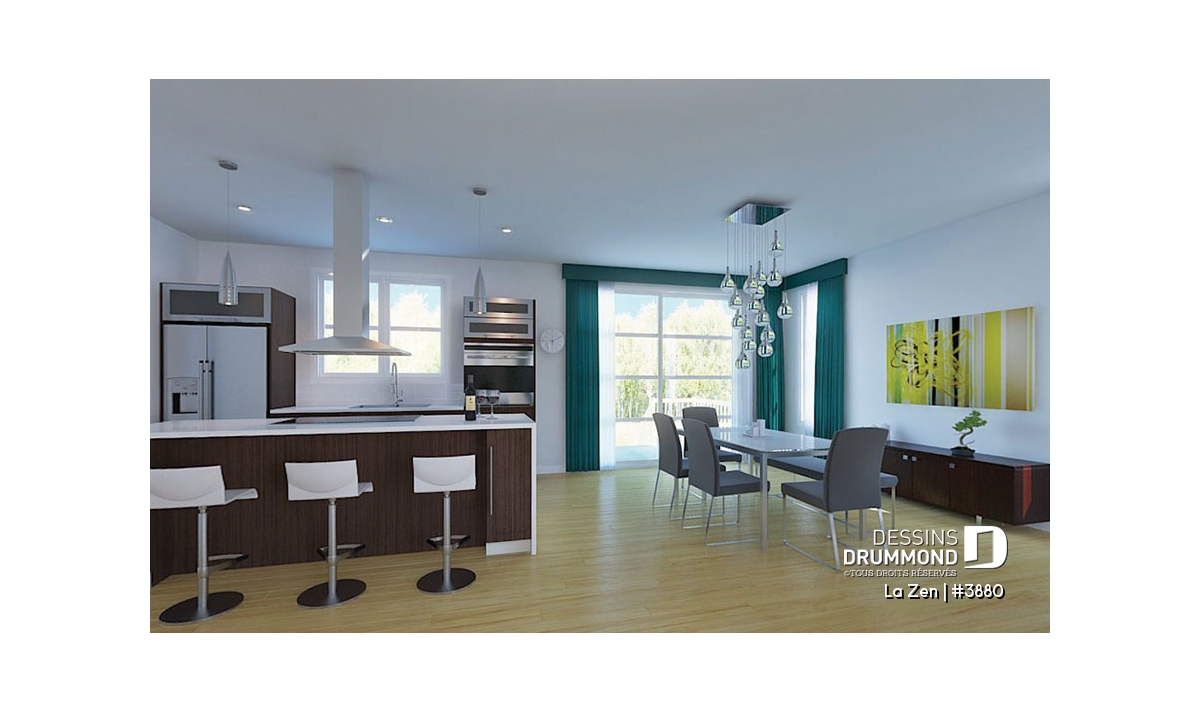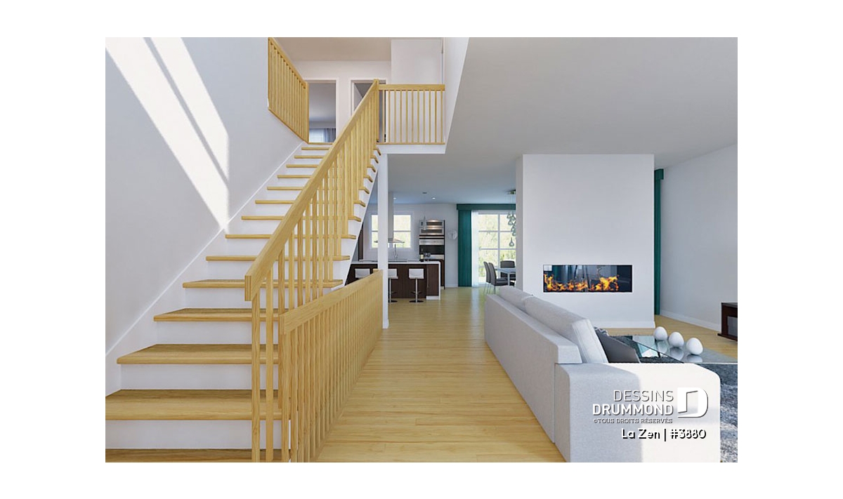 Passé le vestibule et sa garde-robe de tout près de 6pi de largeur, on découvre une salle de séjour de plus de 16pi x 16pi avec foyer ouvert sur deux côtés, une salle à manger pouvant loger une table de huit convives, une cuisine avec îlot-lunch imposant et un garde-manger walk-in de près de 8pi x 6pi auquel le concepteur a cru fort pratique de jumeler une buanderie avec comptoir pour plier le linge et chute à linge en provenance de l’étage. De plus, un garage faisant16pi x 24pi propose une entrée de service avec garde-robe et coin toilette/lavabo tout près pour encore plus d’utilité.