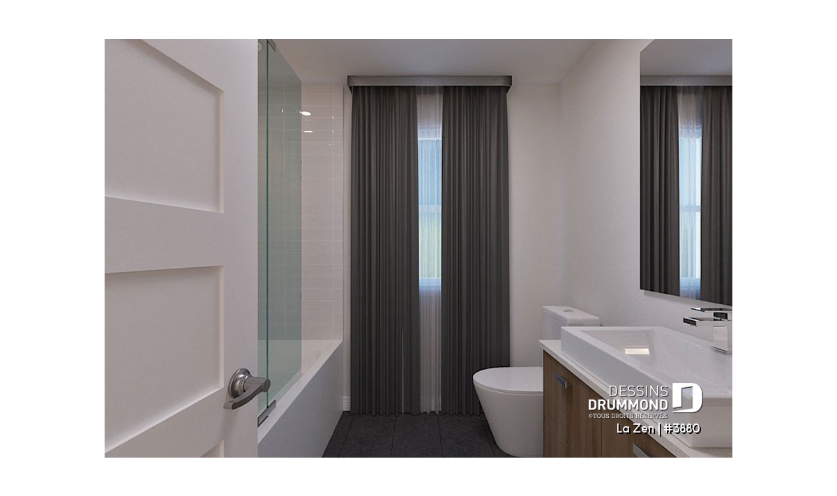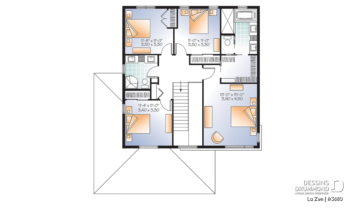 À l’étage, auquel on accède par un escalier linéaire dégagé sur 7pi de largeur, on constate la présence de trois chambres secondaires d’au moins 11pi x 11pi et d’une suite des maîtres avec garde-robe walk-in et salle de bain privée dotée d’une vanité double, d’une toilette en cabine et d’une douche indépendante de 3pi x 6pi. Sans oublier, cette salle de douche pour les enfants avec vanité double.