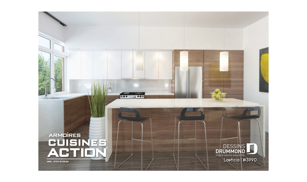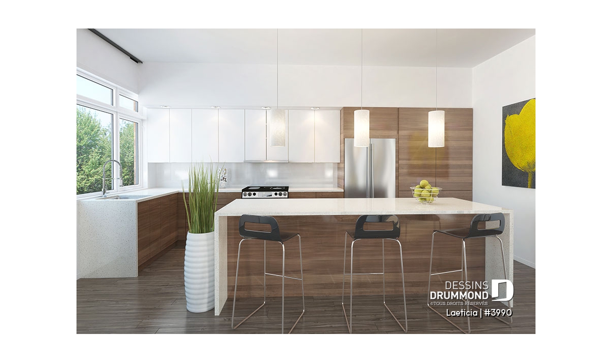 Cuisine avec très grand îlot et ouverte vers la salle à dîner et la salle de séjour.