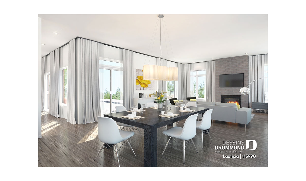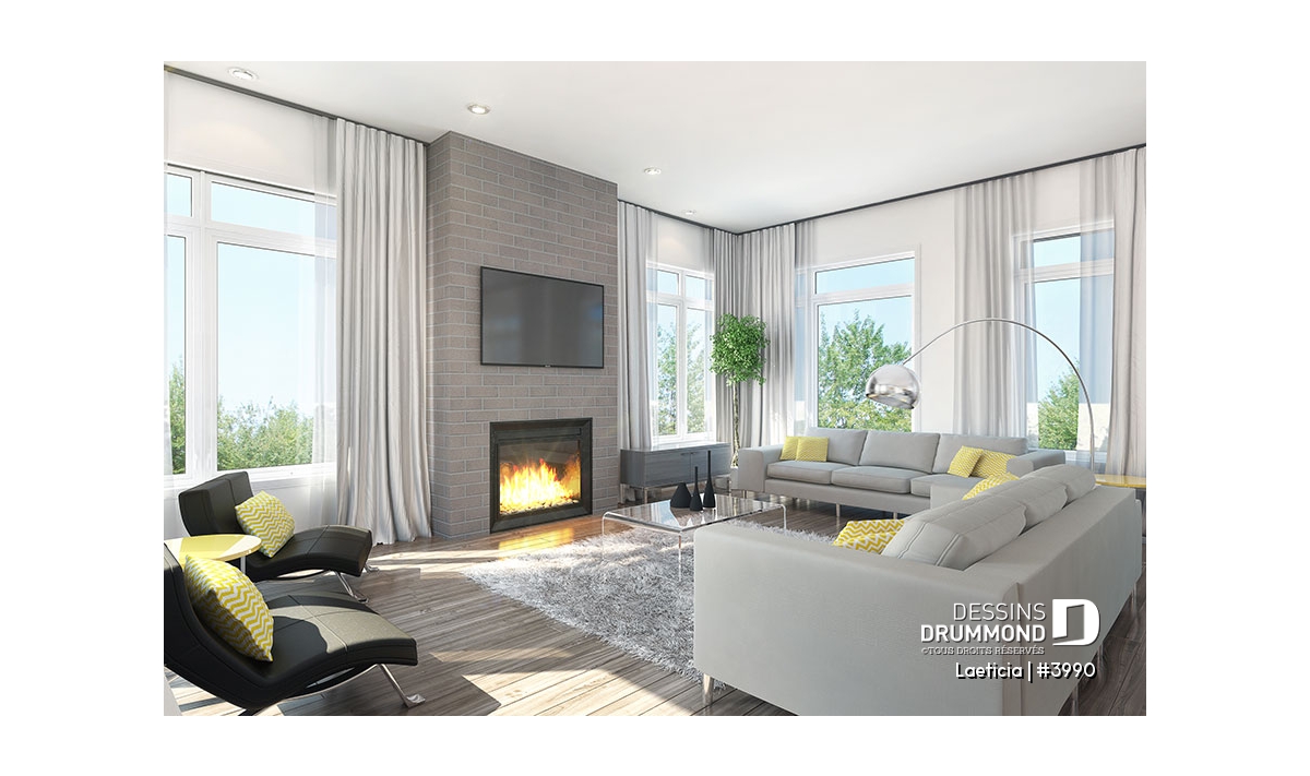 Salle de séjour avec foyer, beaucoup de lumières naturelles et accès à la piscine.
