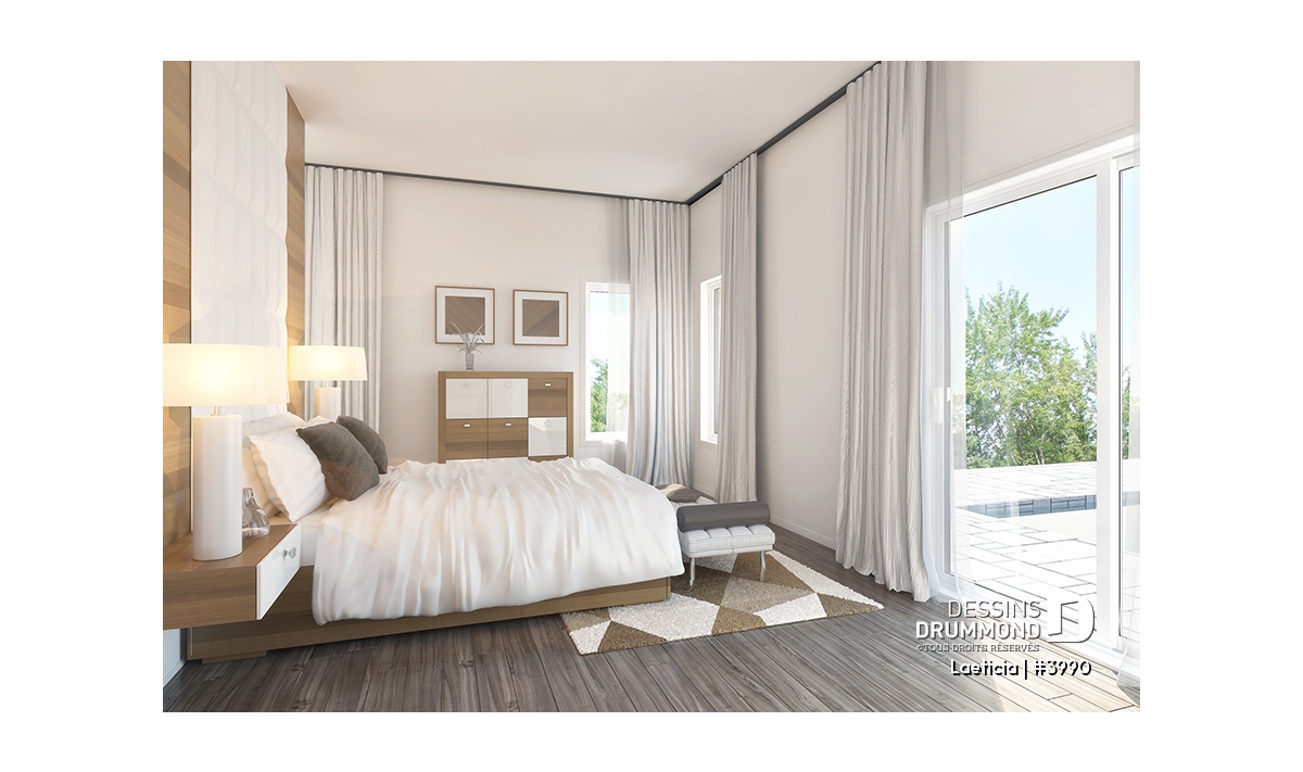 Chambre des maîtres avec porte vers la piscine, grand walk-in derrière le lit et accès direct à la salle de bain complète.