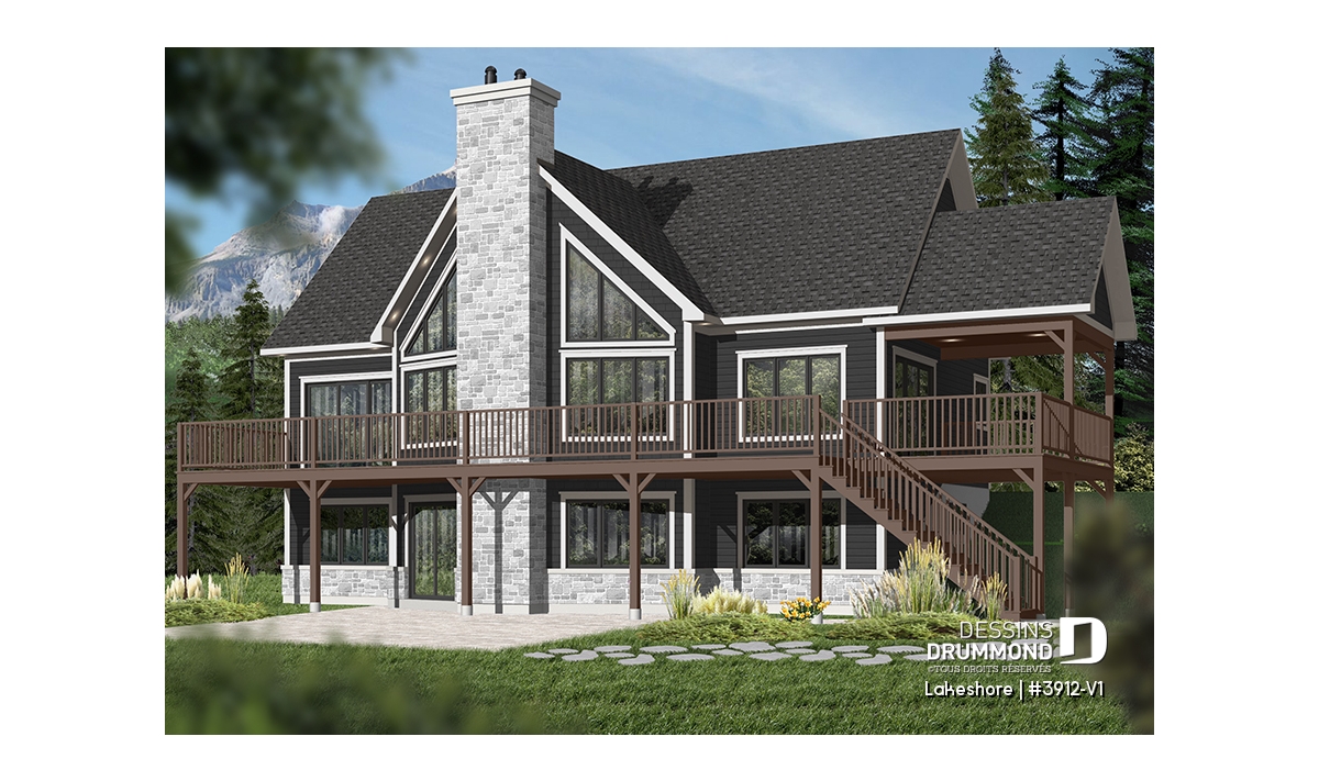 Conçu à partir du très populaire « chalet » 3912, lui-même issu du 2912, ce 3912-V1 se veut un modèle version sans garage doté d’une entrée principale située sur la façade opposée. Ainsi, la façade officiant comme façade donnant sur la rue pour les modèles 2912 et 3912, devient ici la façade arrière donnant sur le panorama alors que l’entrée principale bénéficie désormais d’un rangement extérieur pour les amateurs de sports de glisse.