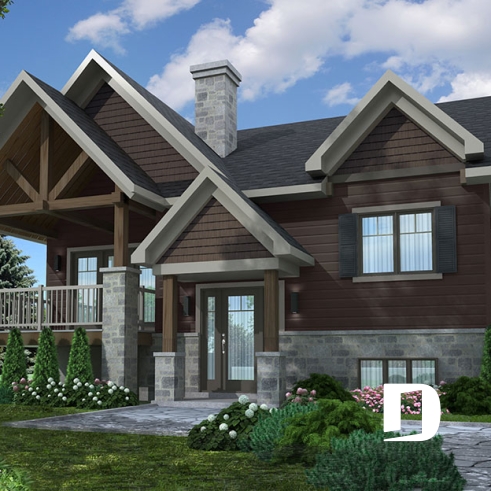 Plan maison 2 chambres, style chalet, balcon avant couvert, poêle à bois, îlot et garde-manger