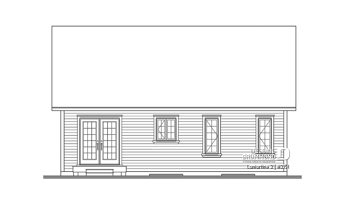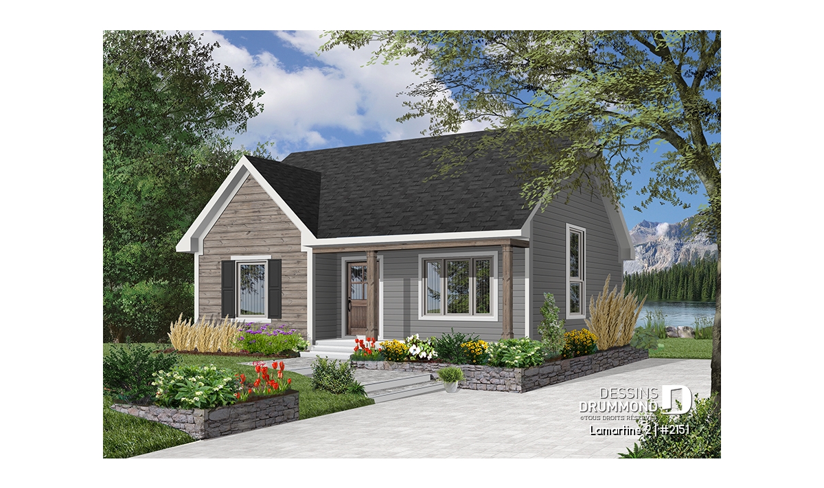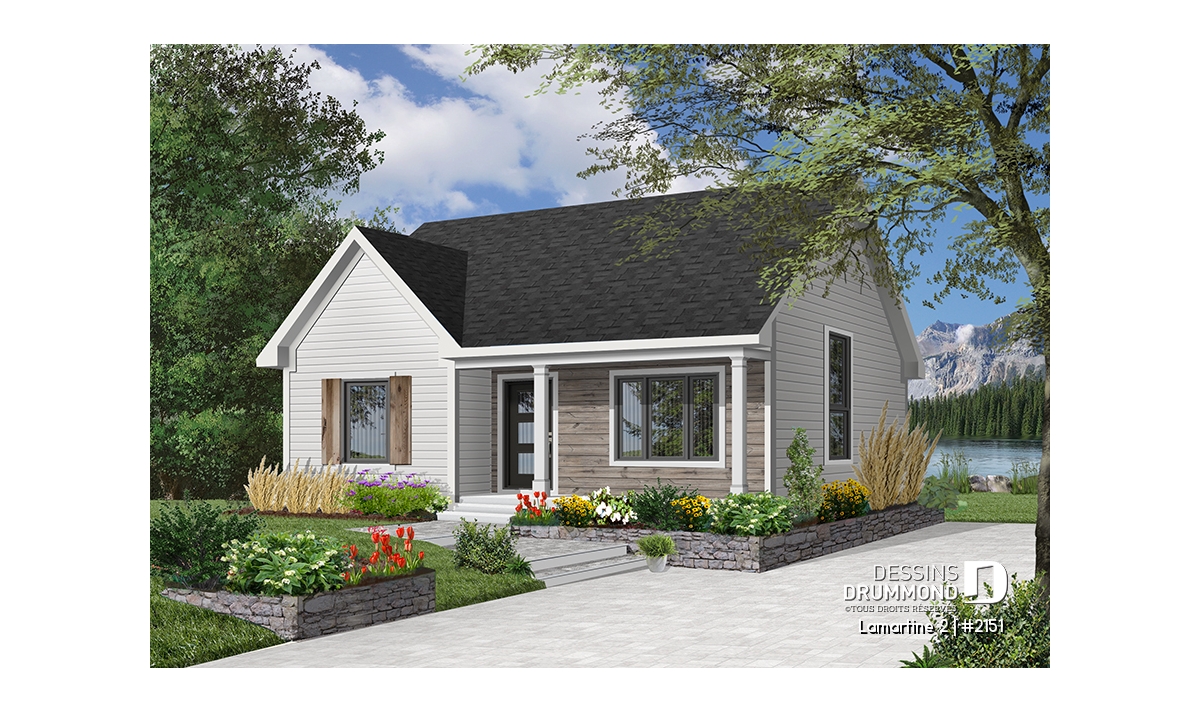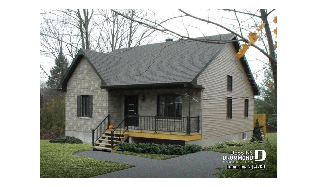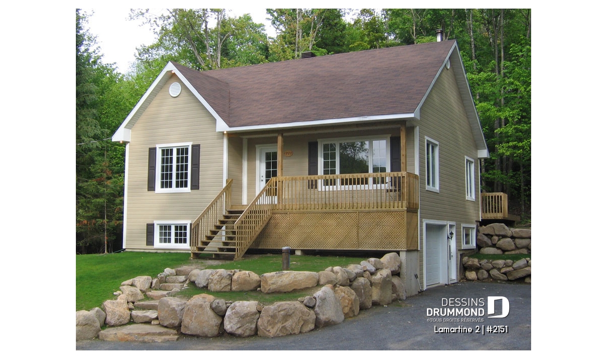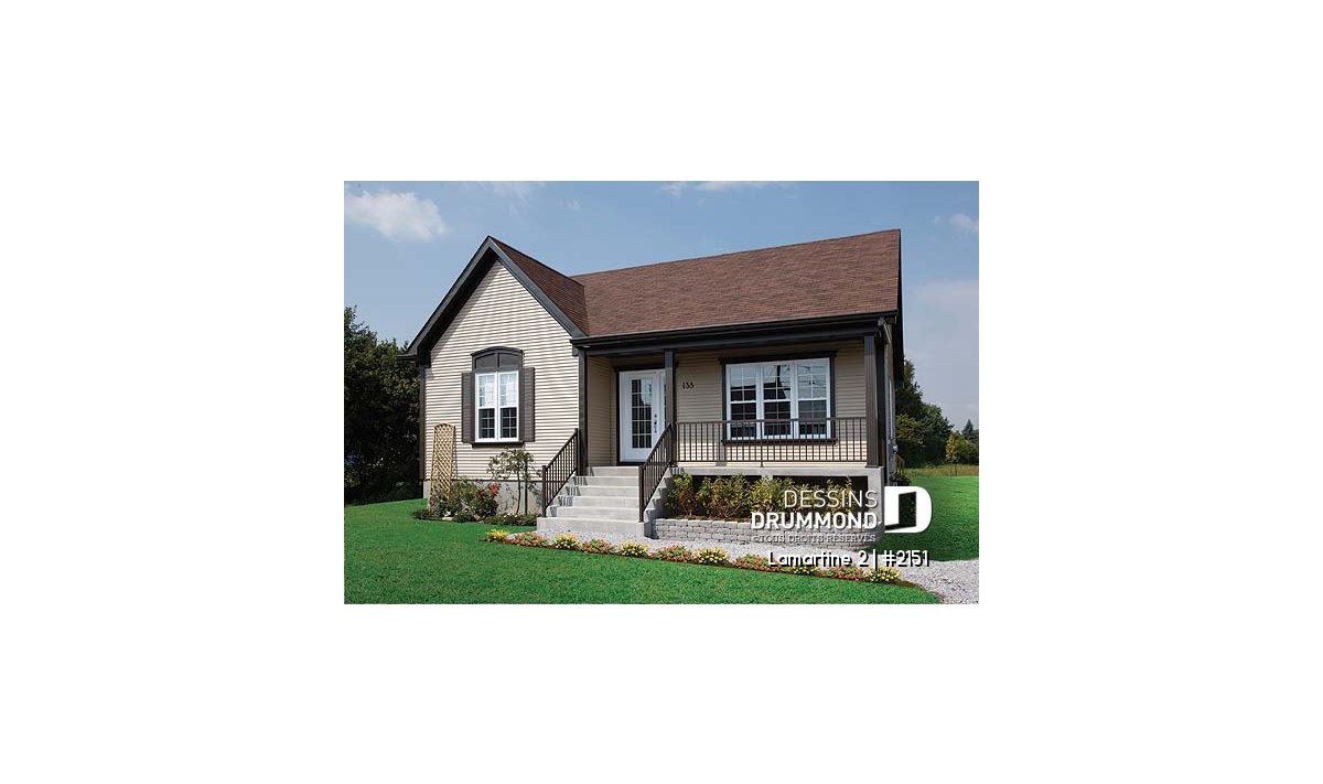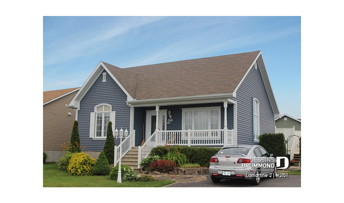 À cela s’ajoute un vestibule à l’entrée avant, une salle de séjour bien confortable avec plafond cathédrale permettant d’aménager, en plein centre du mur latéral droit, une fenêtre élancée alimentant en lumière tout le centre de la maison et le puits d’escalier. Un grand garde-manger, un bel espace cuisine/salle à manger, toujours à plafond cathédrale, deux belles chambres et une salle de bain des mieux organisées contribuent assurément à alimenter la popularité de ce modèle.