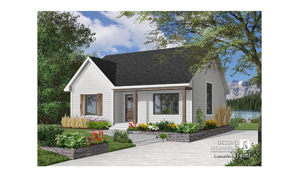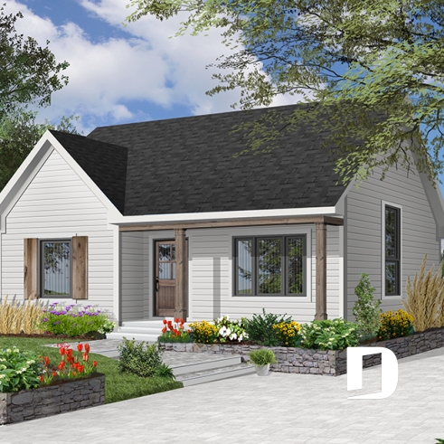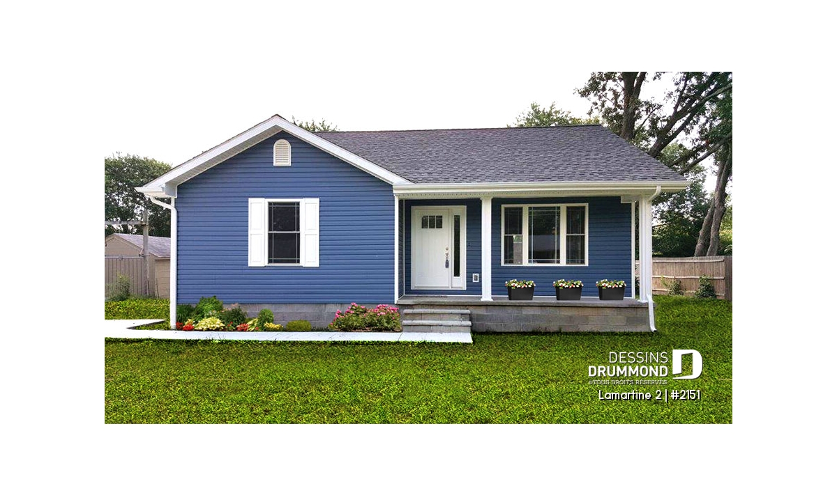 Plan d'un bungalow style ranch économique, balcon avant abrité, 2 chambres, plafond cathédrale, rangement