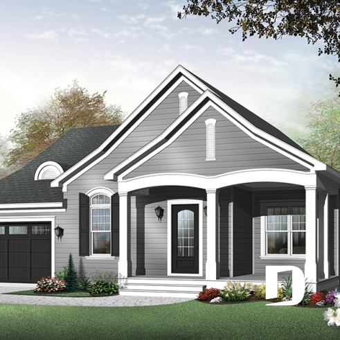 Plan de plain-pied champêtre, garage, 2 chambres, 2 s.bain, grande suite des parents, plafond 9', foyer