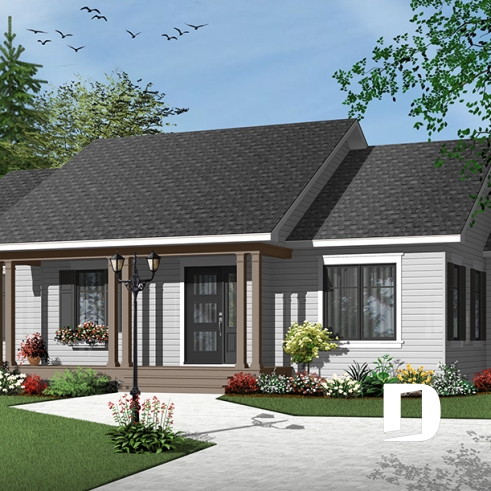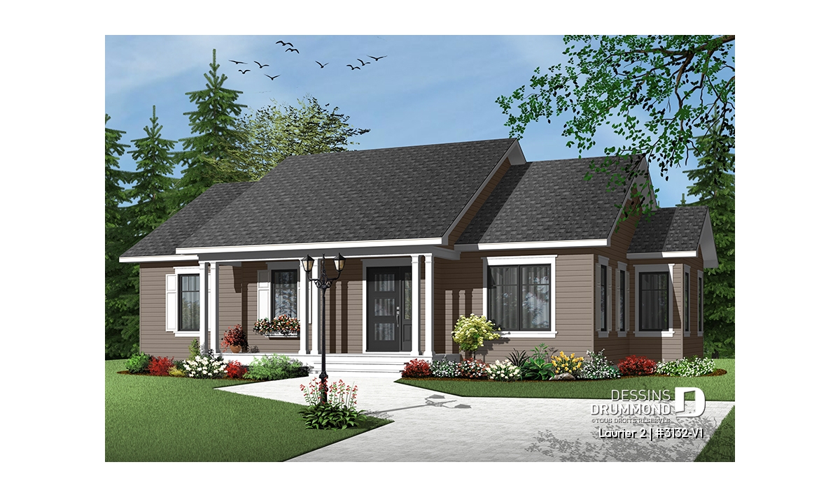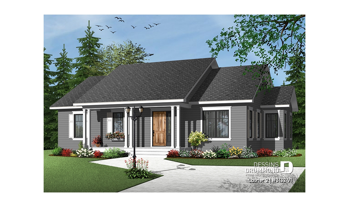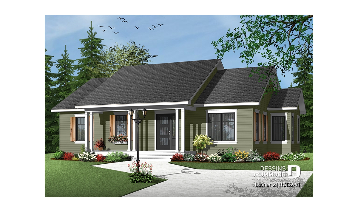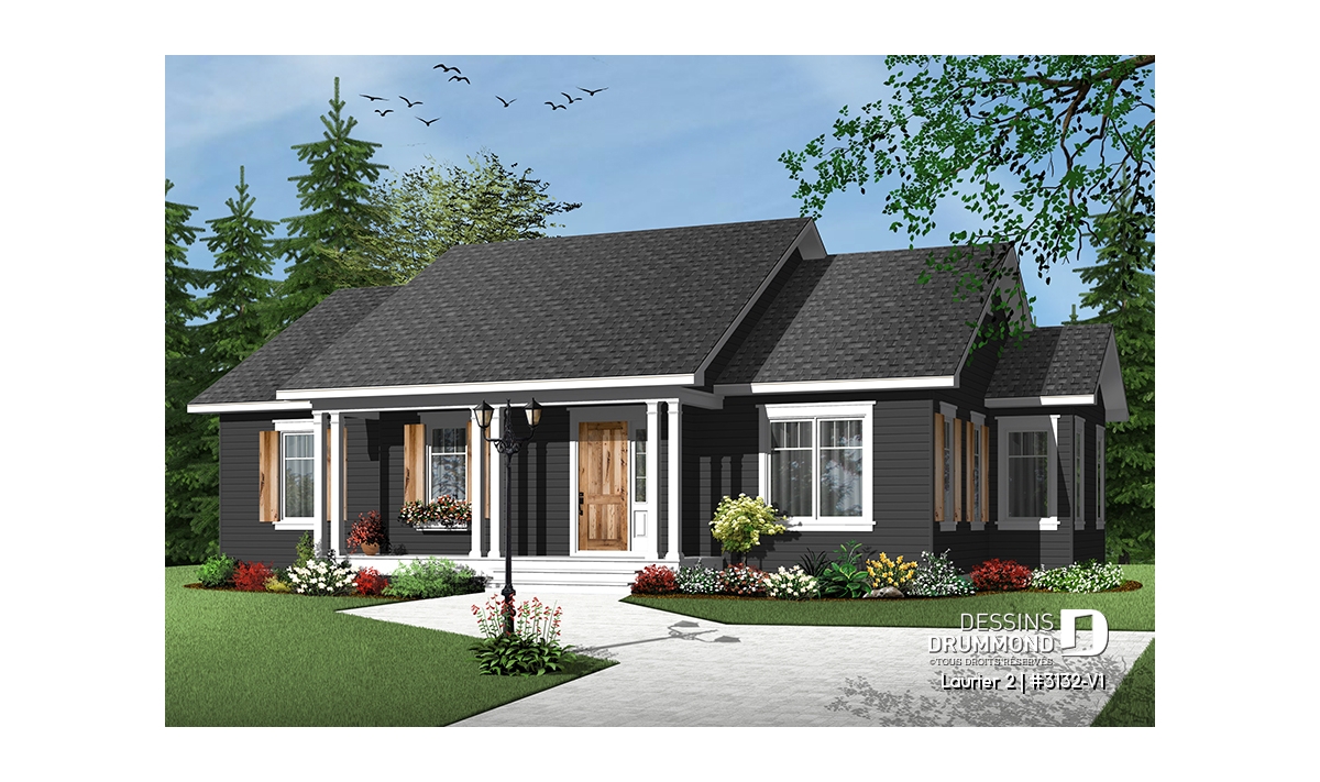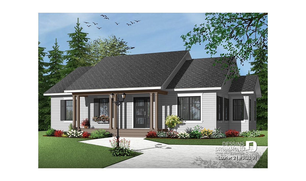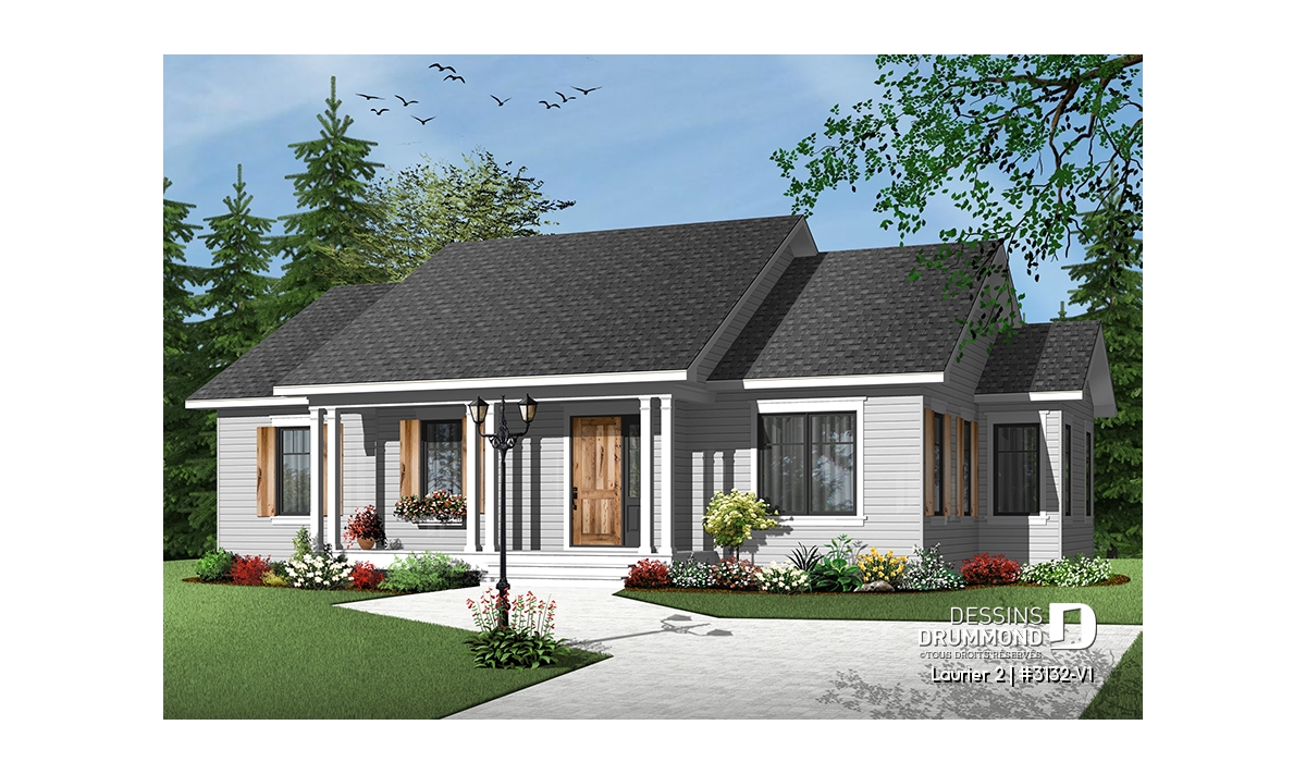 Plan de bungalow champêtre 3 chambres, cuisine attrayante, aire ouverte, salle de lavage au premier