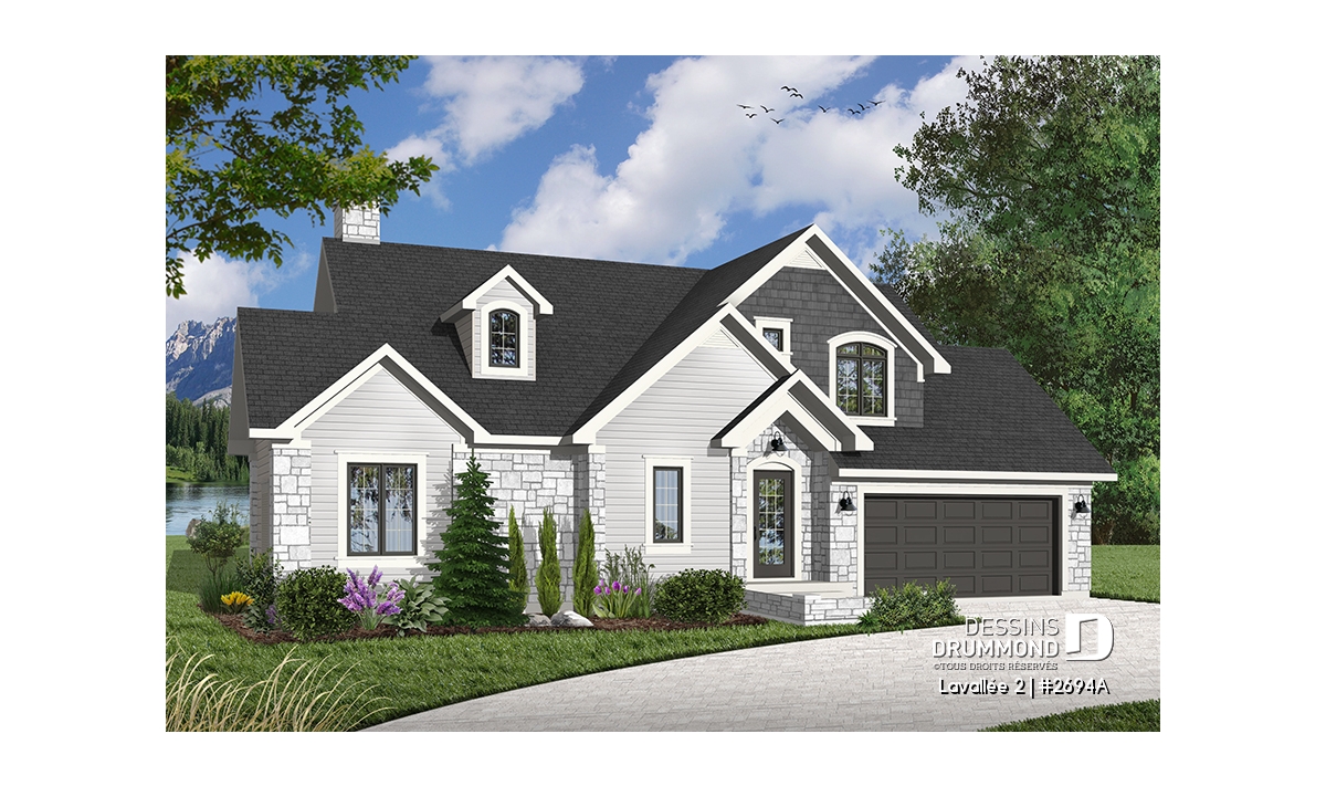 Foyer, Plafond cathédrale, Mezzanine, Suite des maîtres au rdc, Salle de lavage au rez-de-chaussée, Bain et douche séparés, Lavabo double, Plafond en pente, Vestibule, Vue paronamique