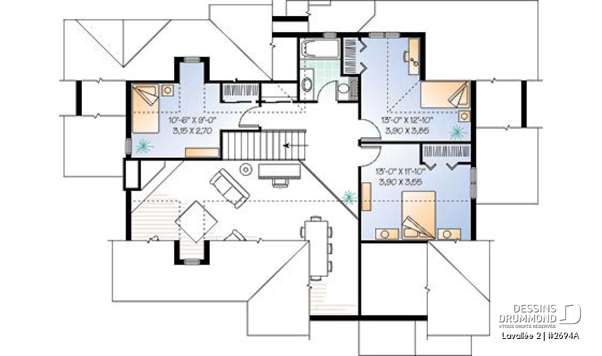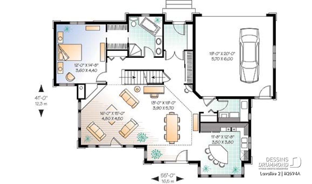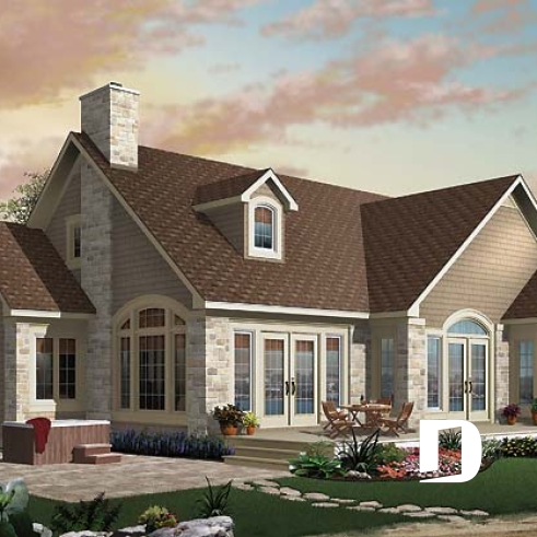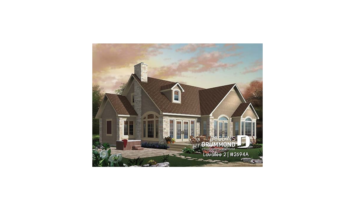 C’est assez difficile à croire, mais ce rez-de-chaussée offre une vue panoramique de la cuisine, de la dînette, de la salle à manger, de la salle de séjour et de la chambre des maîtres rencontrant ainsi la très fréquente demande de bien des futurs propriétaires à l’effet de maximiser la vue pour une maison à aménager aux abords d’un lac, d’une rivière ou de tout autre point de vue panoramique. Dessins Drummond vous propose d’ailleurs le modèle 3916, avec sous-sol aménagé, pour ceux dont le site est caractérisé par un certain dénivelé vers l’arrière.