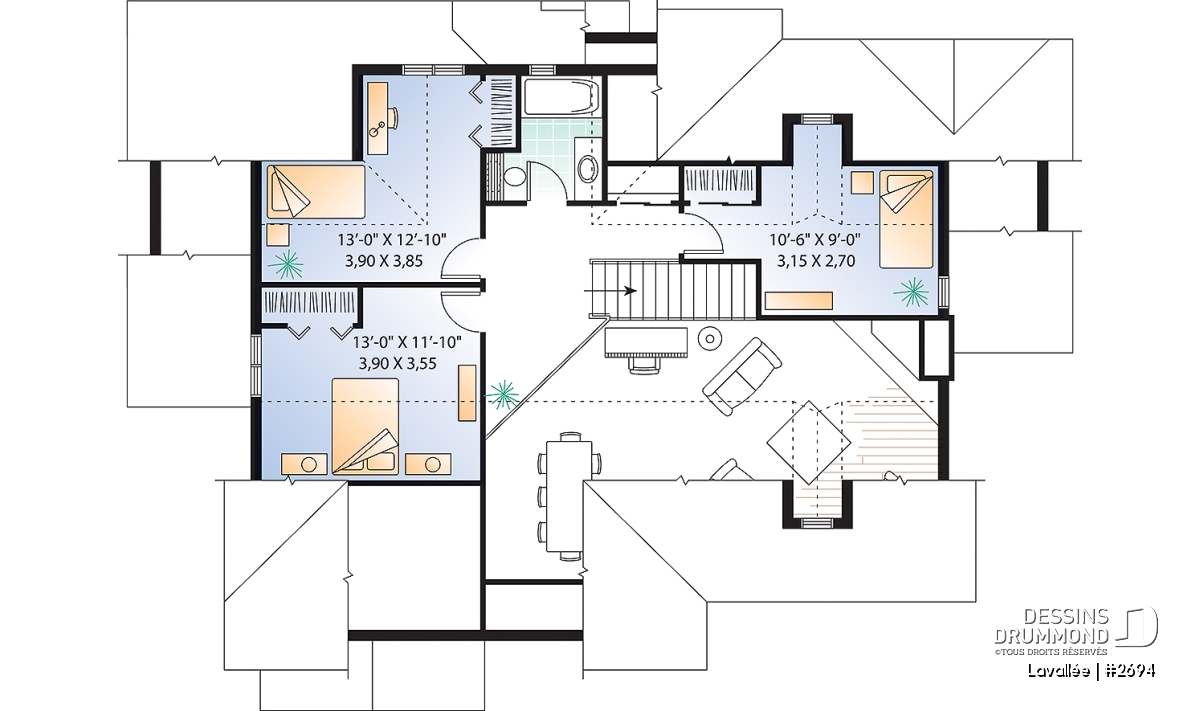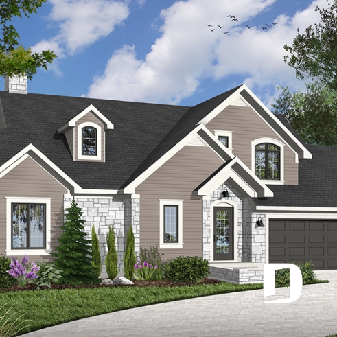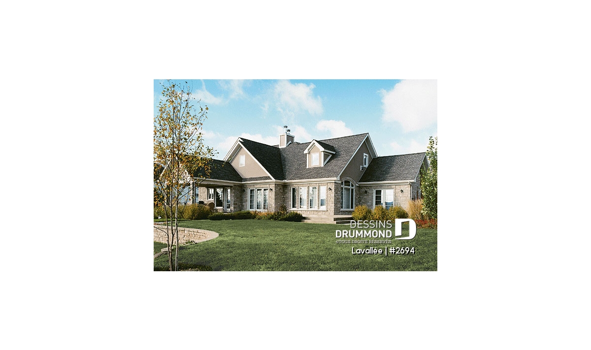C’est assez difficile à croire, mais ce rez-de-chaussée offre une vue panoramique de la cuisine, de la dînette, de la salle à manger, de la salle de séjour et de la chambre des maîtres rencontrant ainsi la très fréquente demande de bien des futurs propriétaires à l’effet de maximiser la vue pour une maison à aménager aux abords d’un lac, d’une rivière ou de tout autre point de vue panoramique. Dessins Drummond vous propose d’ailleurs le modèle 3916, avec sous-sol aménagé, pour ceux dont le site est caractérisé par un certain dénivelé vers l’arrière.