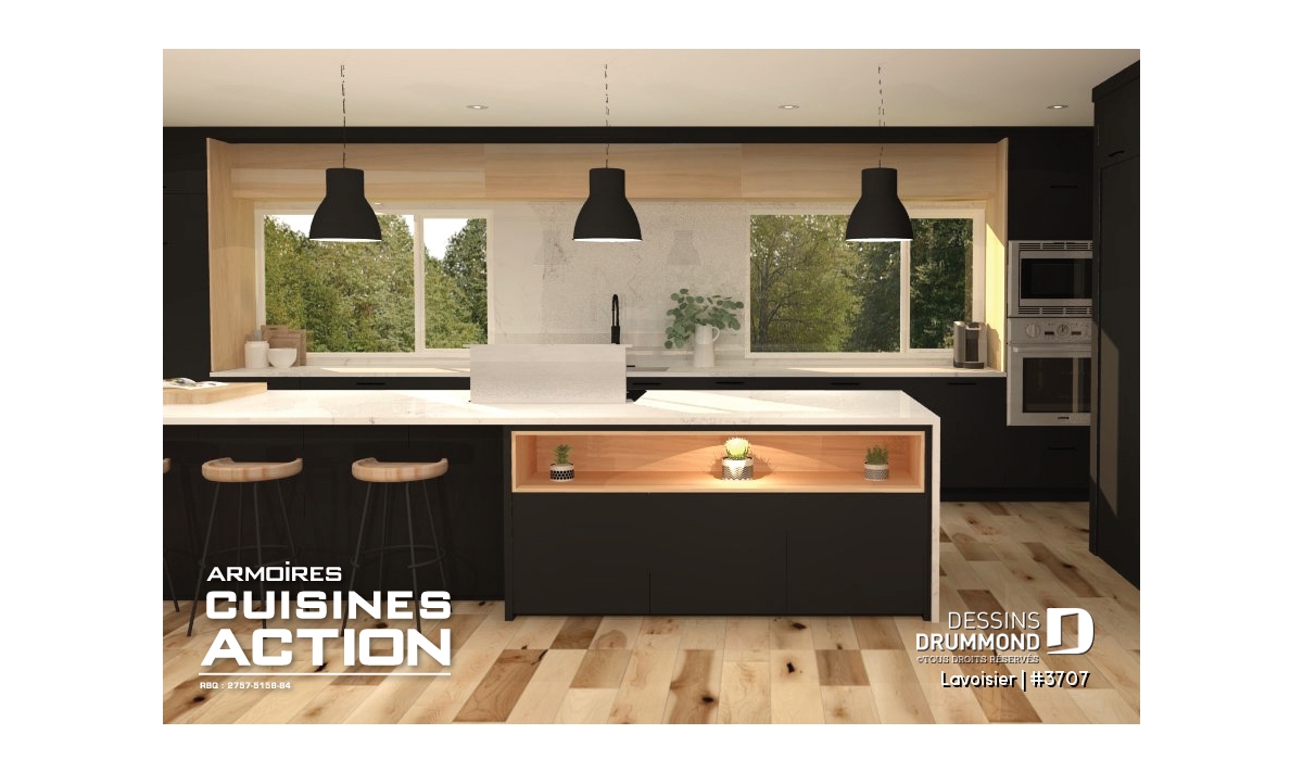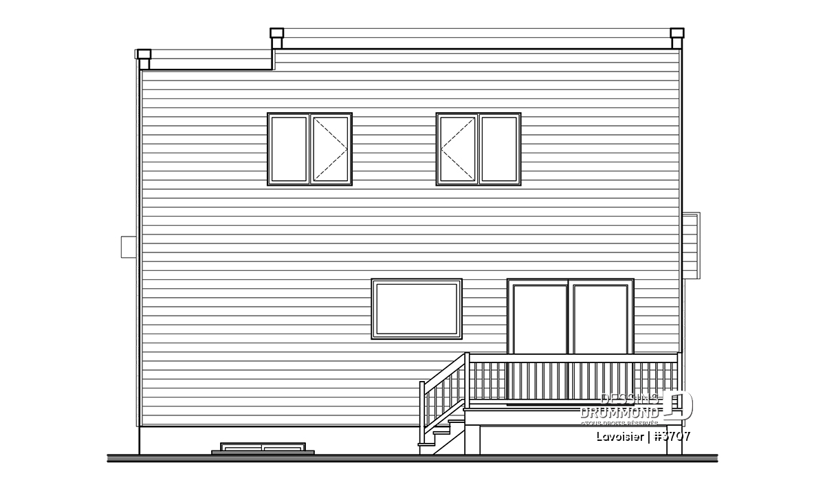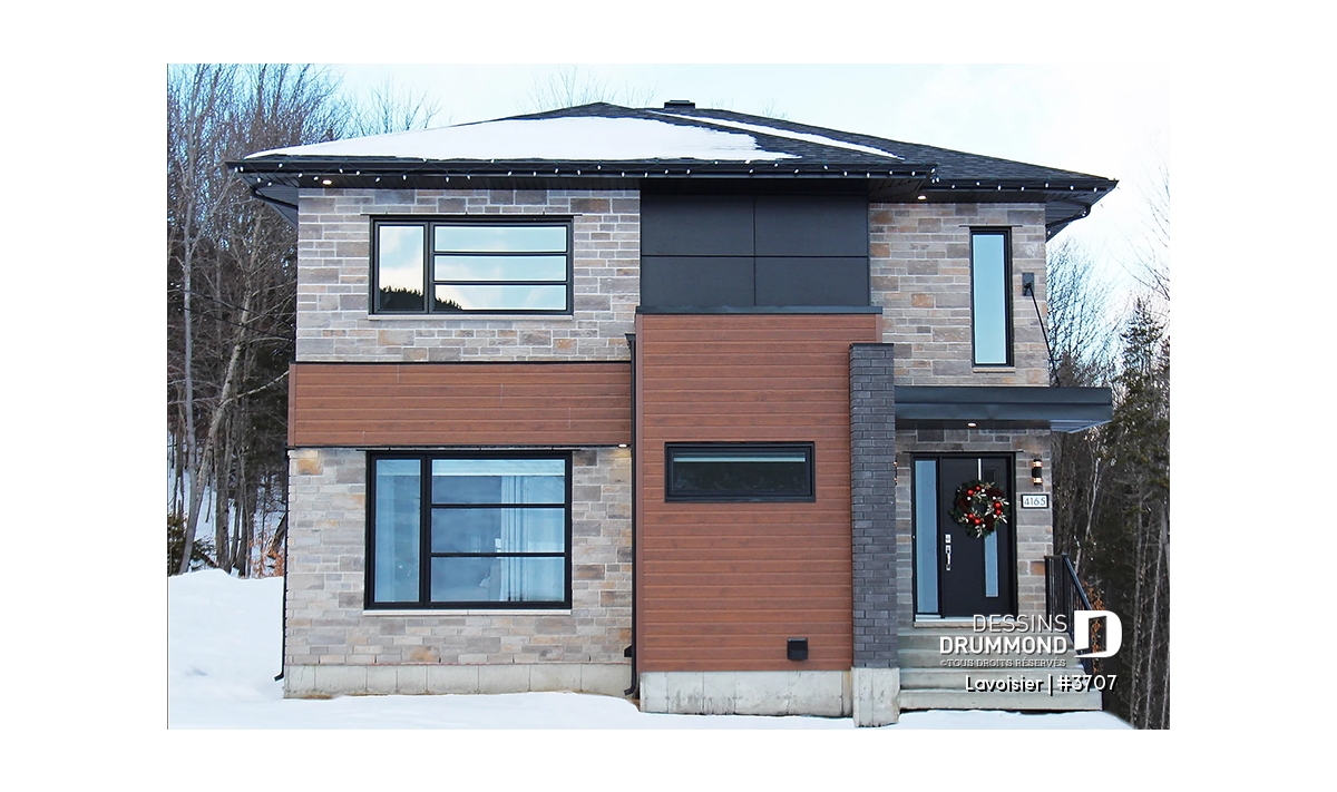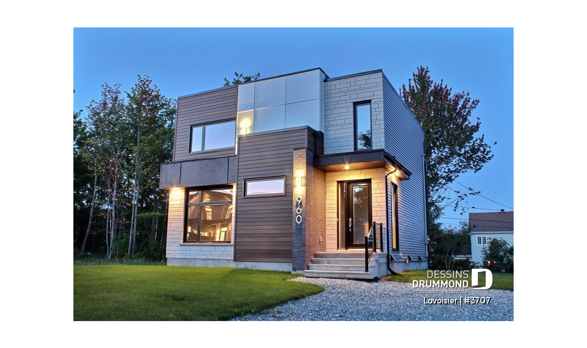 Le plan de maison moderne de style cubique # 3707 de Dessins Drummond (aussi nommé Lavoisier) a été conçu par notre agence Dessins Drummond de Lévis. Ce modèle contemporain à étage comporte un total de 1680 pieds carrés aménagés, un sous-sol à aménager éventuellement et propose trois chambres à l’étage.