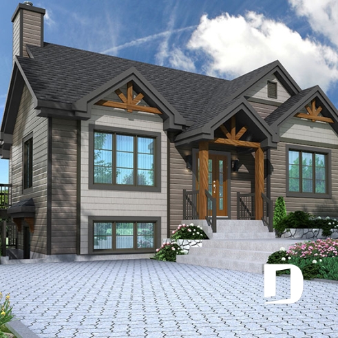 En proposant une entrée split et un accès direct au sous-sol, ce modèle, plan # 2131-V1 aussi nommé Le Cape 2, s’apparente davantage à une maison à étage qu’à une maison de plain-pied. En effet, sa fenestration abondante, sa grande terrasse à l’arrière et son look ressorti de terre en font une maison très lumineuse et d’une certaine envergure.