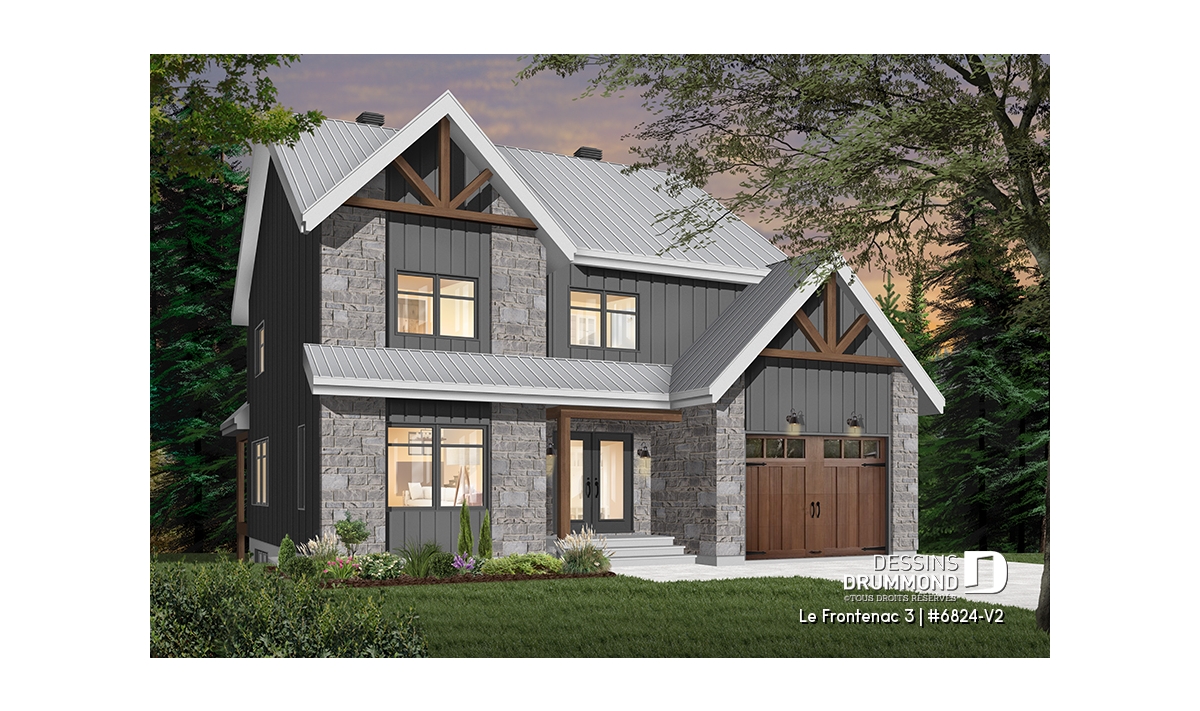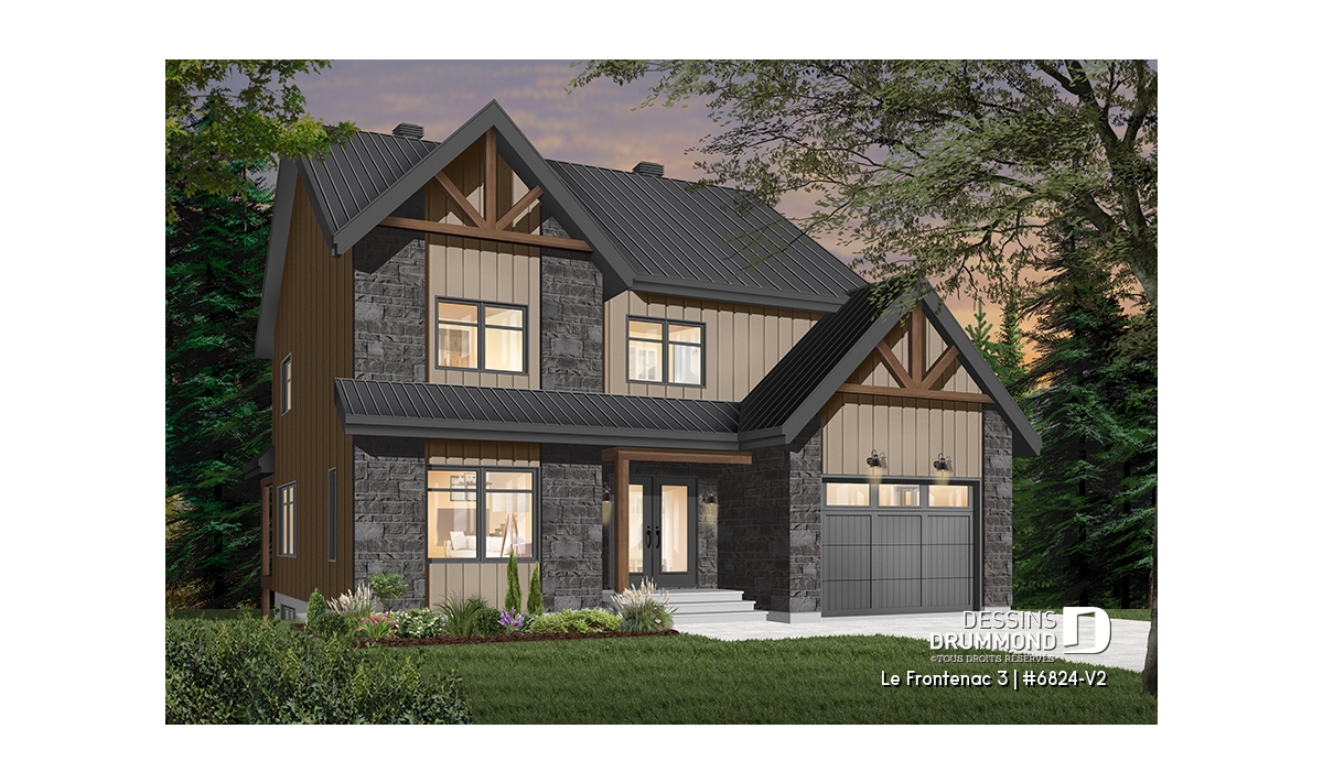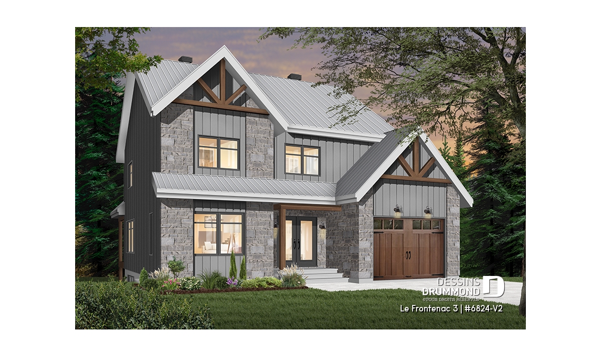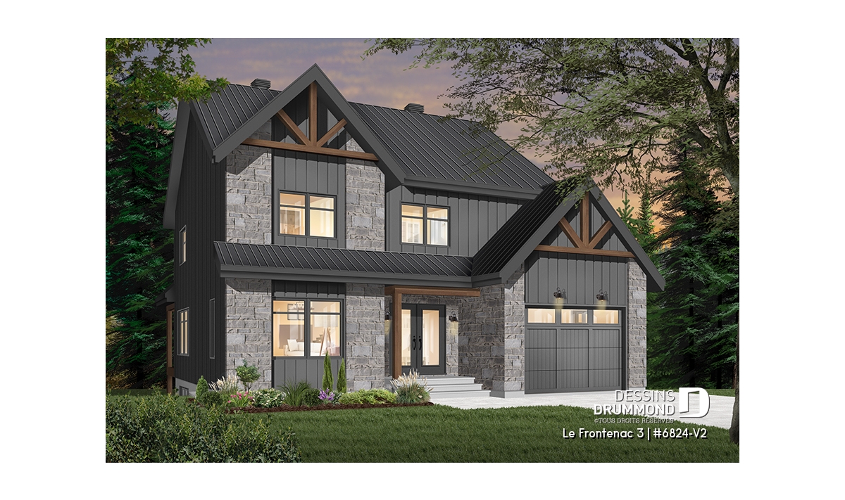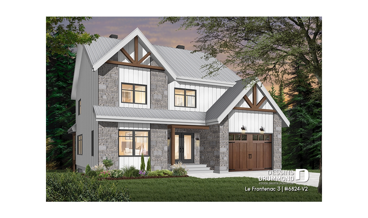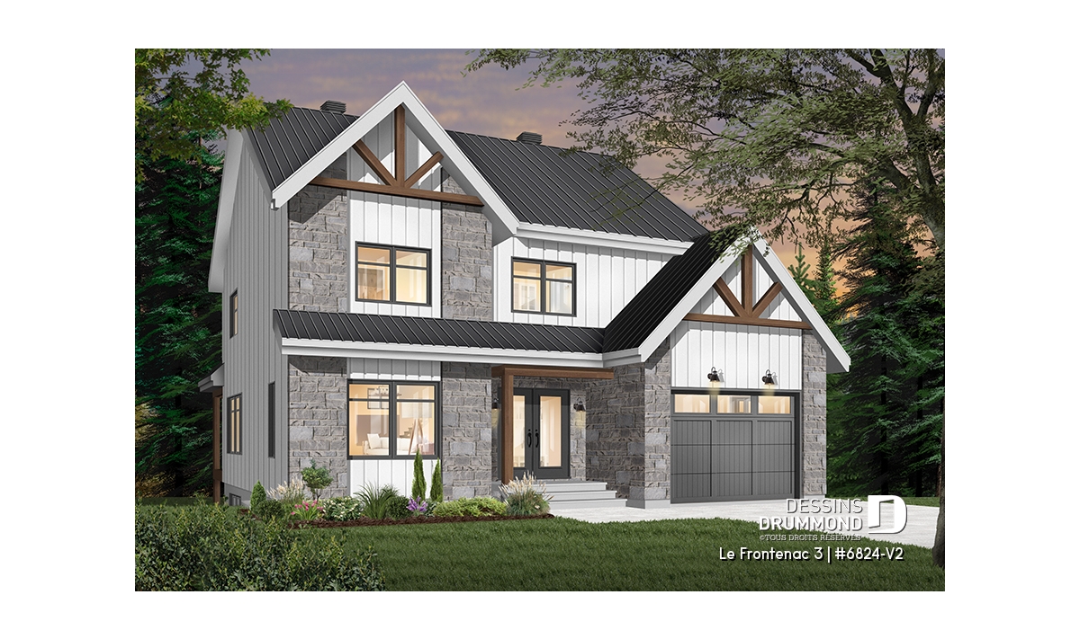 Plan de maison de style tendance champêtre rustique, à étage avec garage et offrant de grandes chambres.