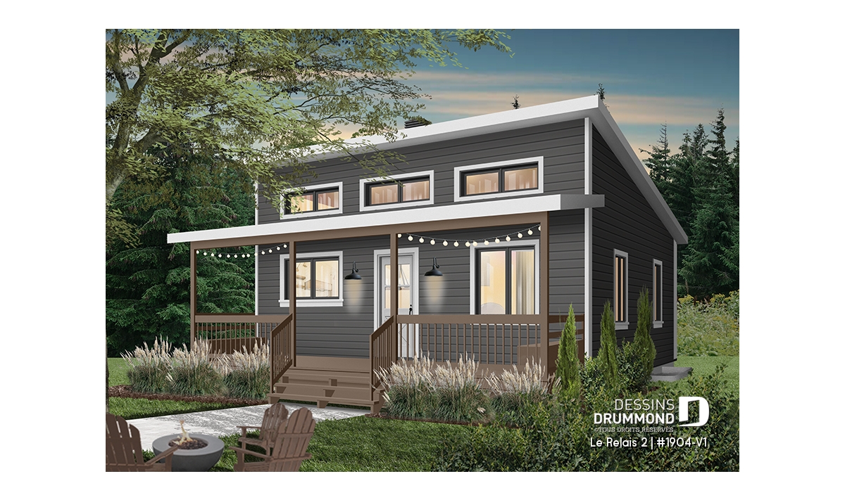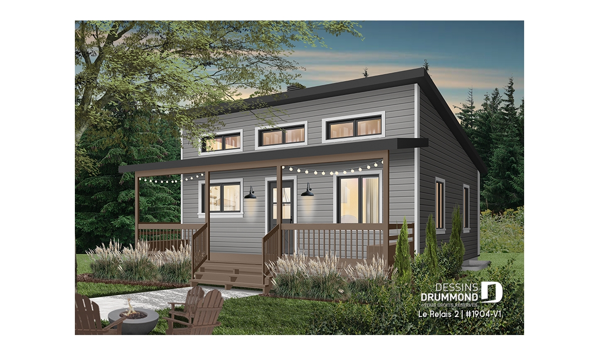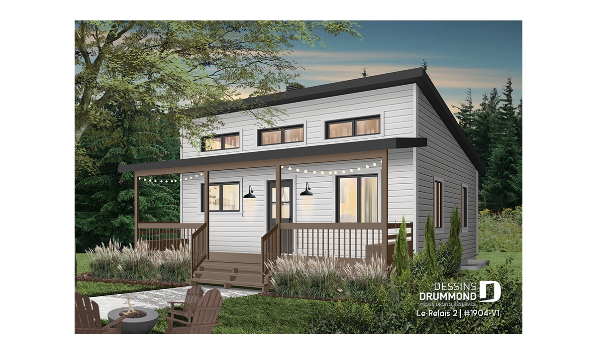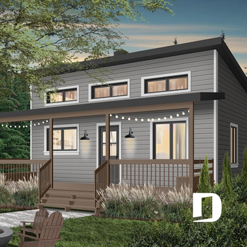 Plan de chalet économique avec sous-sol, balcon couvert, une chambre, poêle à bois, cathédral