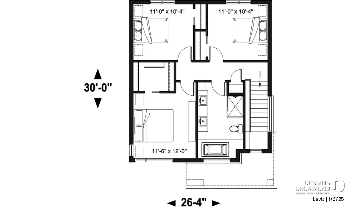 À l’étage, on est agréablement surpris par le format des trois chambres alors que les deux plus petites font 11pi x 10’4’’pi et que dire des garde-robes qui y sont rattachées comme ce grand walk-in à la chambre des maîtres. On constate de plus une salle de bain complète avec douche indépendante, large vanité à deux éviers et bain sous la fenêtre avant.
