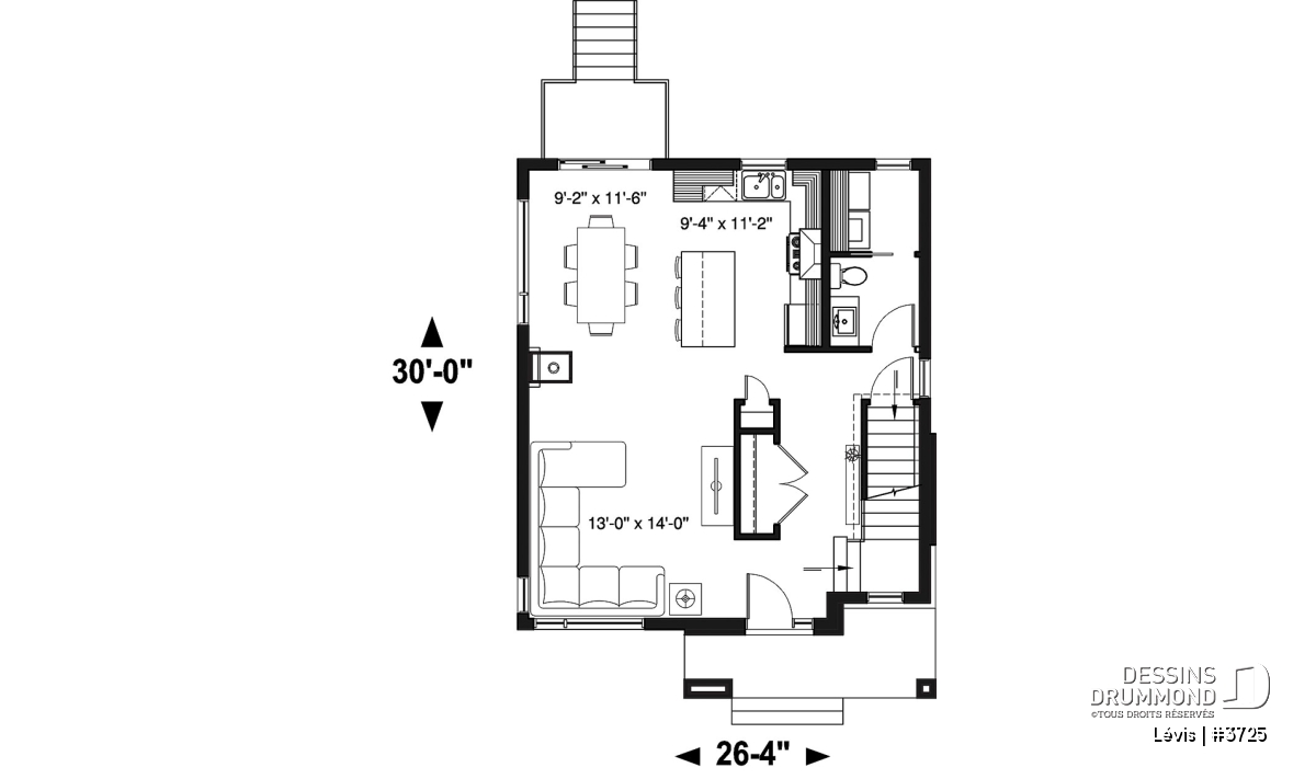 Salle de séjour et salle à dîner séparées par un foyer trois faces. grand îlot et garde-manger à la cuisine.