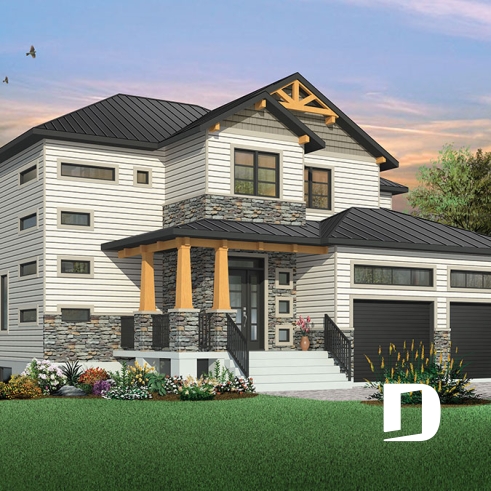 Les lignes simples de ce modèle contrastent avec la couleur des matériaux nobles utilisés partiellement à l'extérieur. Son toit en métal ainsi que les poutres de bois sont les éléments qui lui donnent son "look" moderne rustique, très tendance et chaleureux.