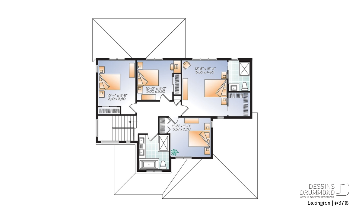 Les 4 chambres à coucher à l'étage incluent une grande suite des maîtres avec salle de bain complète et grand garde-robe de style "walk-in". Les trois chambres secondaires se partagent une deuxième salle de bain avec bain, grande douche et lavabo double.