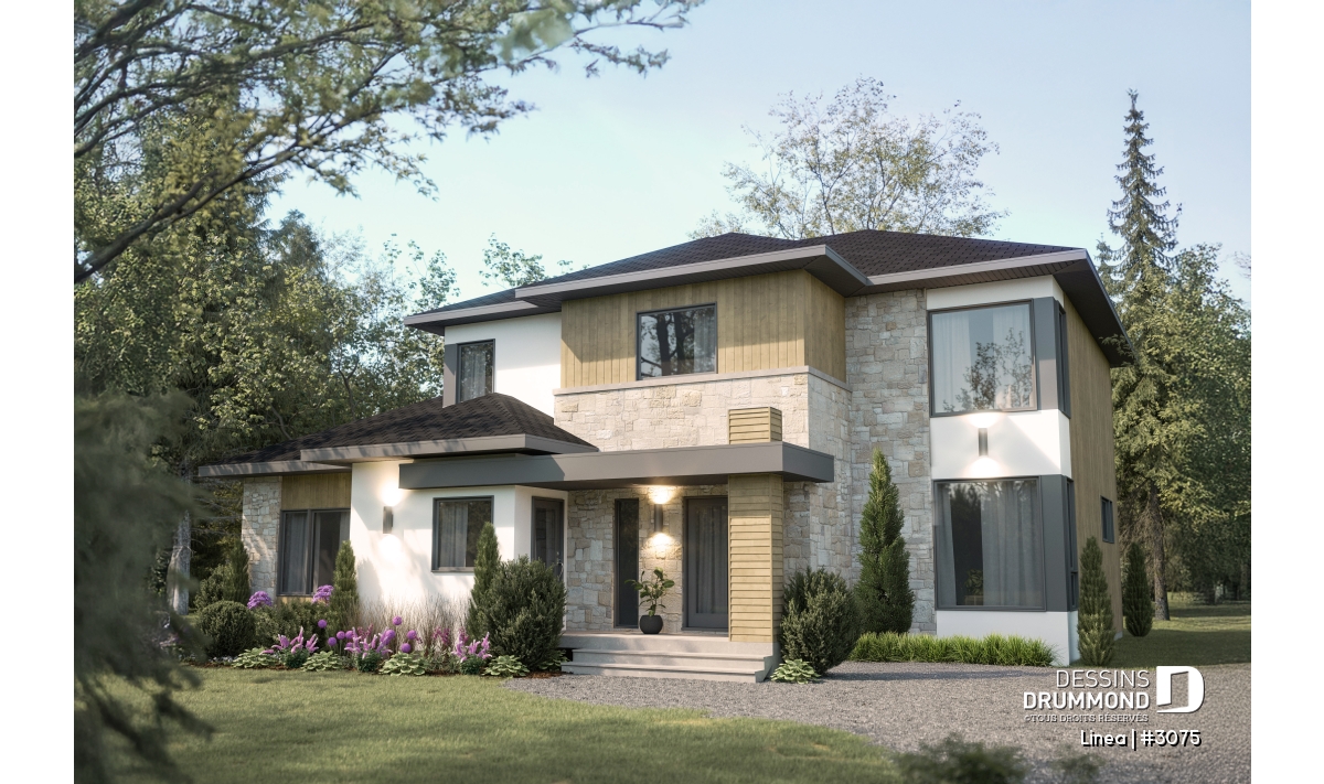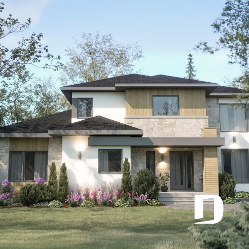 Ce magnifique plan de maison bi-génération à étage allie esthétique contemporaine et fonctionnalité pensée pour la vie familiale. Son architecture élégante se distingue par un amalgame harmonieux de matériaux aux teintes douces et chaleureuses, créant une allure intemporelle et accueillante. Véritable havre de confort, il offre deux logements distincts tout en favorisant la proximité grâce à des espaces communs bien étudiés.