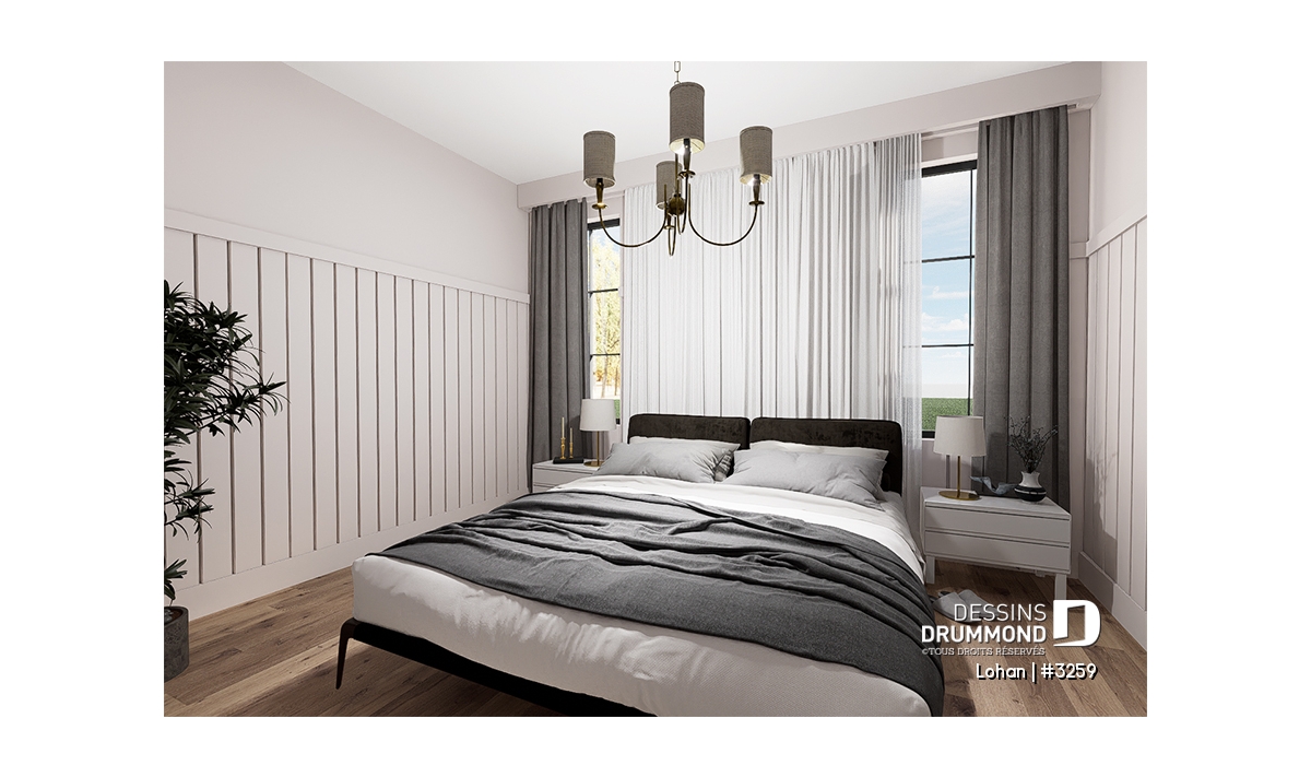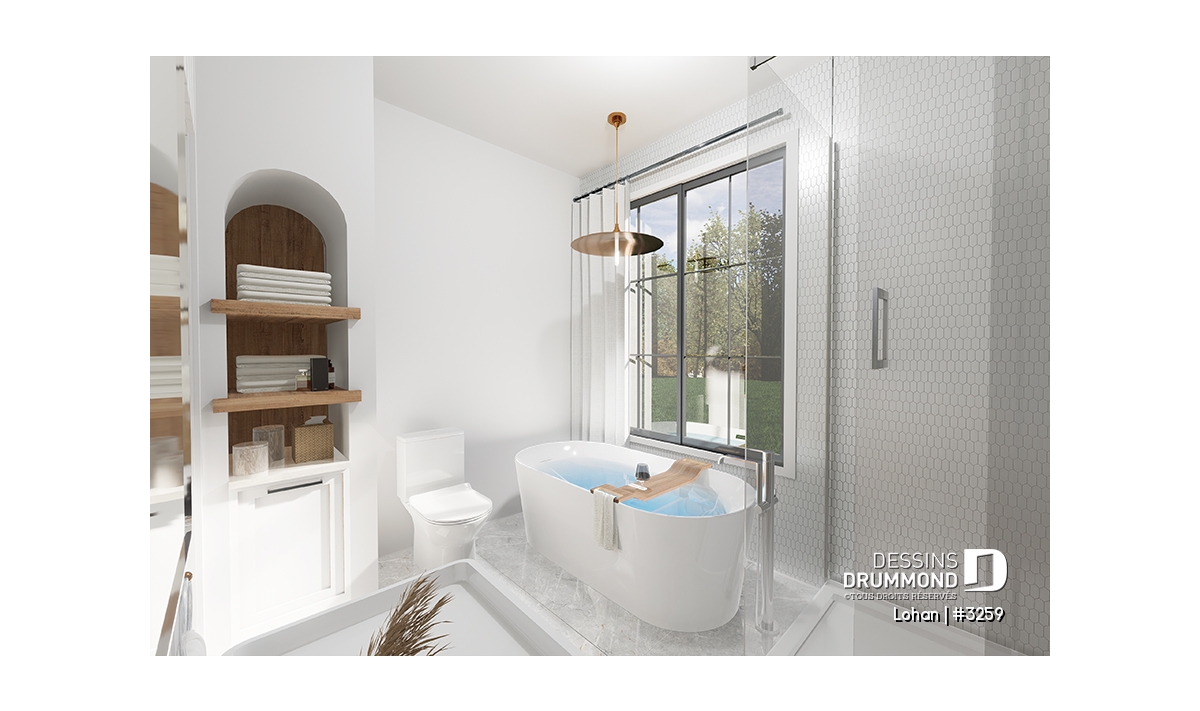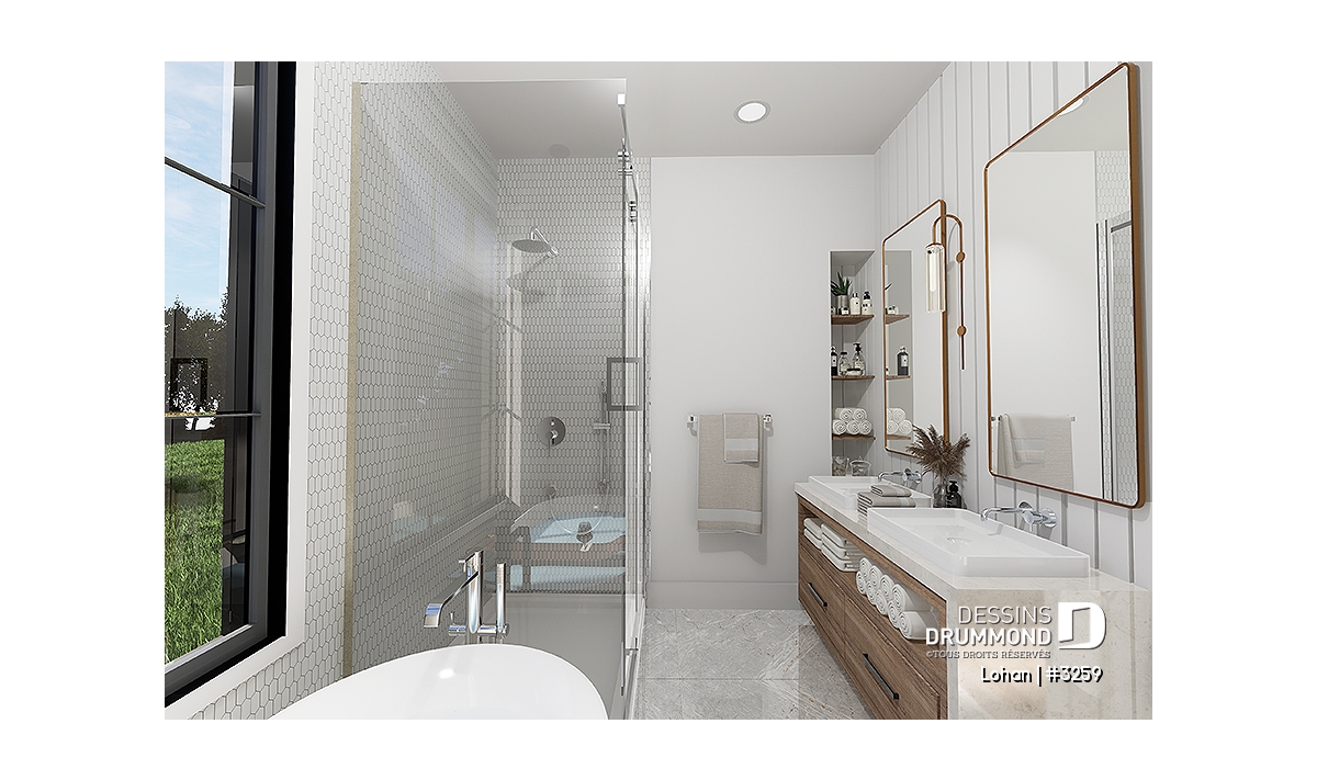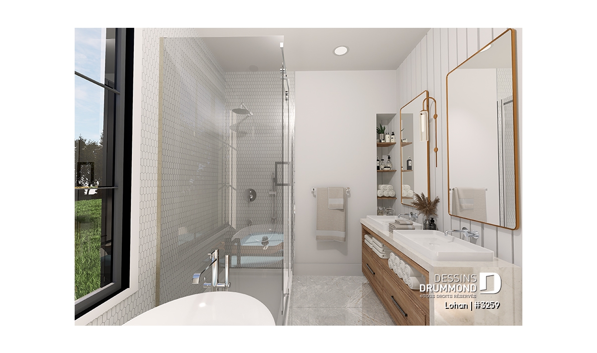 Chambres des maîtres avec walk-in et salle de bain privée, regroupant deux lavabos, bain et douche. Un mur en arche est également prévu entre le walk-in et la salle de bain de ce secteur.