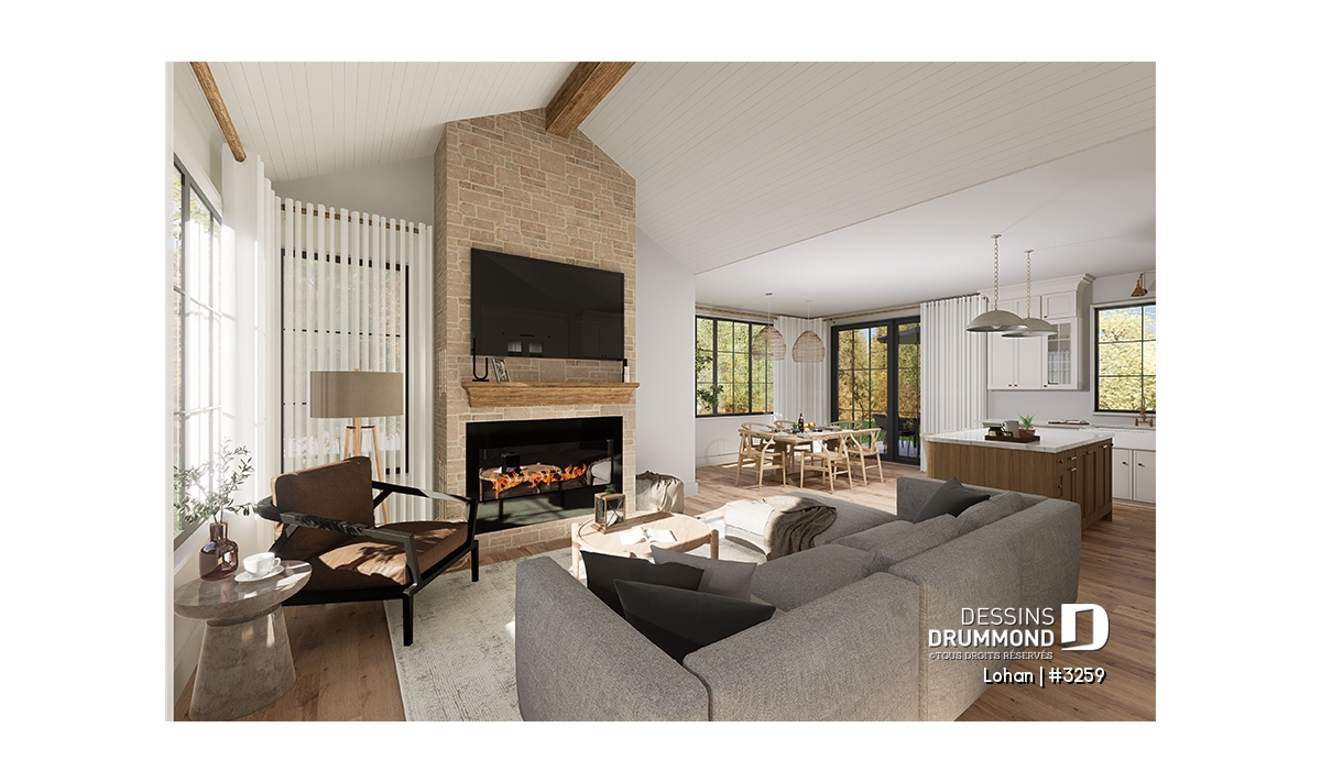 Salle de séjour avec plafond cathédrale et foyer, ainsi qu'un mur prévu avec tablettes.