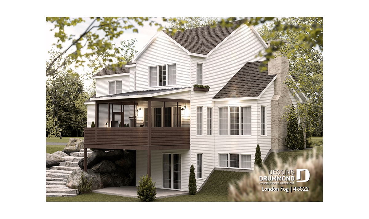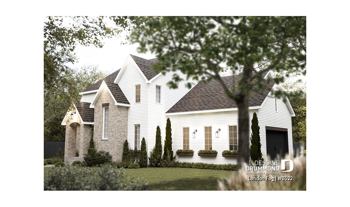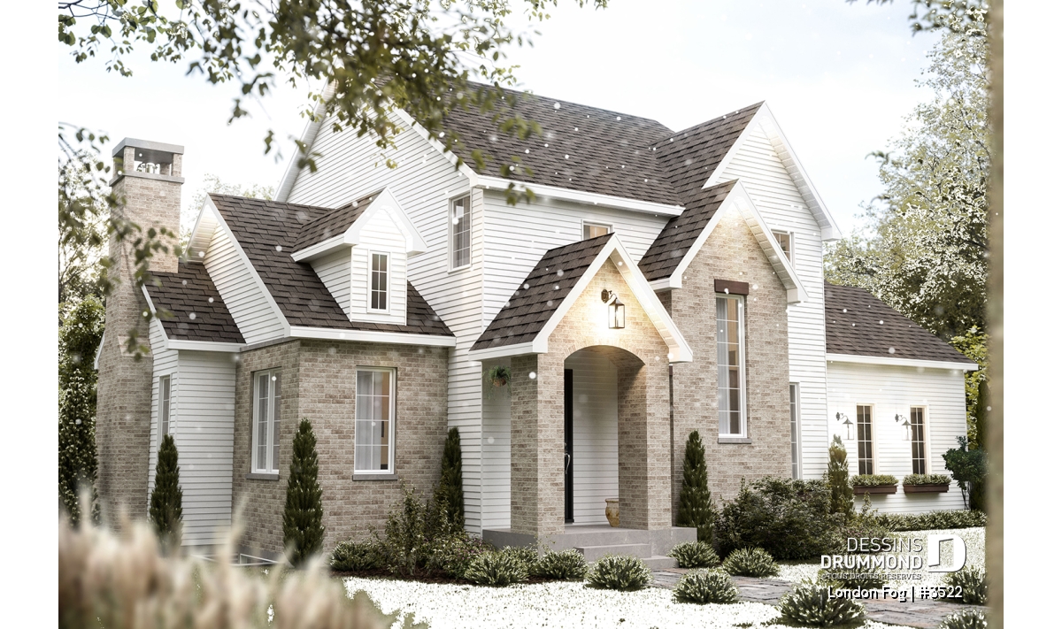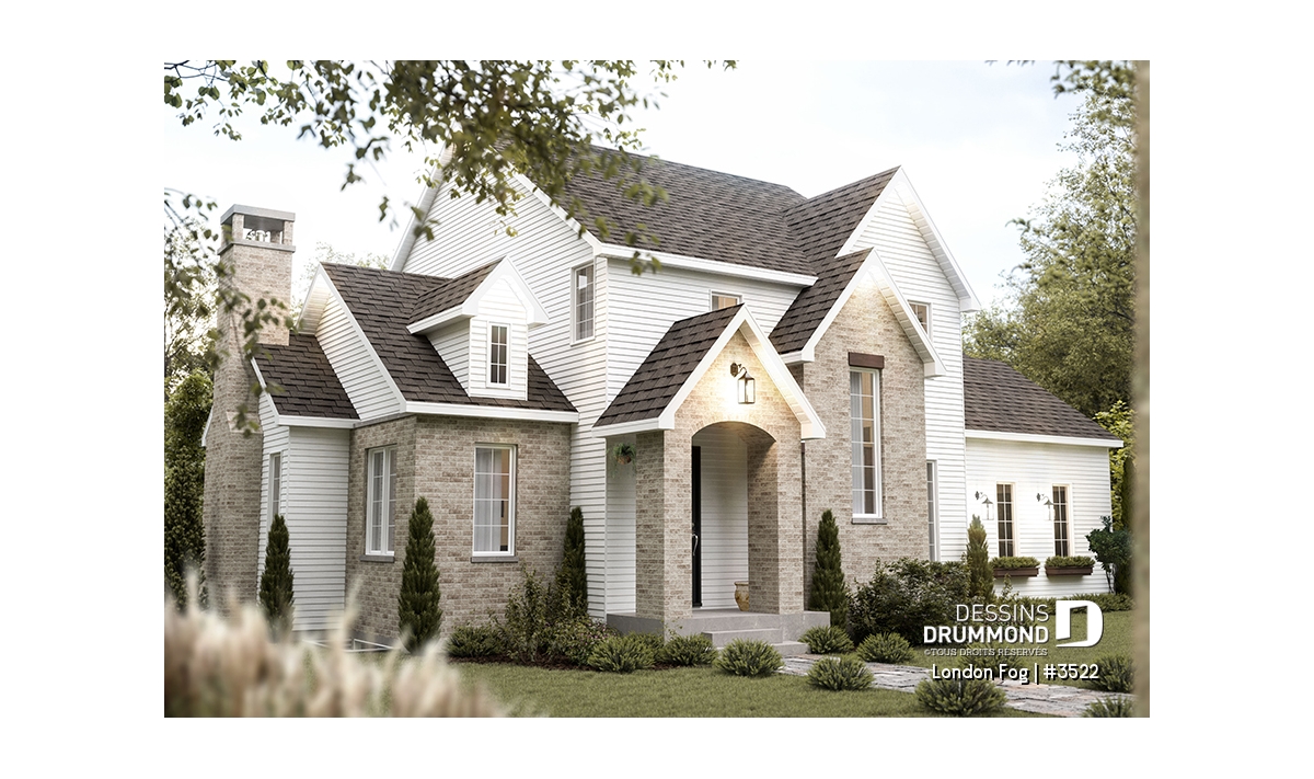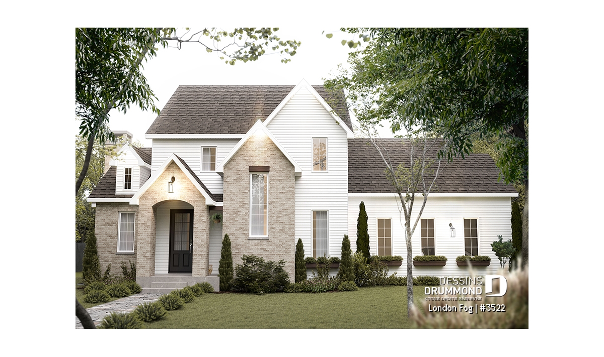 Le plan de maison LONDON FOG (plan #3522) a été conçu par notre directrice artistique, Jenn, pour une jeune famille qui souhaitait avoir une maison de style « English cottage » avec pentes de toit prononcées, lucarnes et un foyer en briques. Ils souhaitaient un style différent et classique qui traverserait le temps. Avec ses 3294 pieds carrés, aménagés sur 3 étages et son garage avec espace boni à aménager à l’étage (éventuellement), chaque membre de votre famille y trouvera son coin de bonheur!