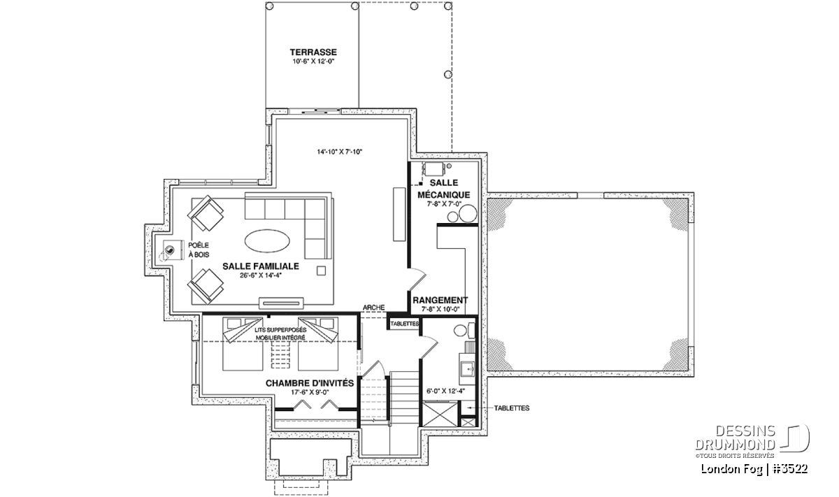 Sous-sol avec salle familiale et poêle à bois, ainsi qu’un accès à une terrasse abritée au niveau du sol.