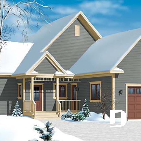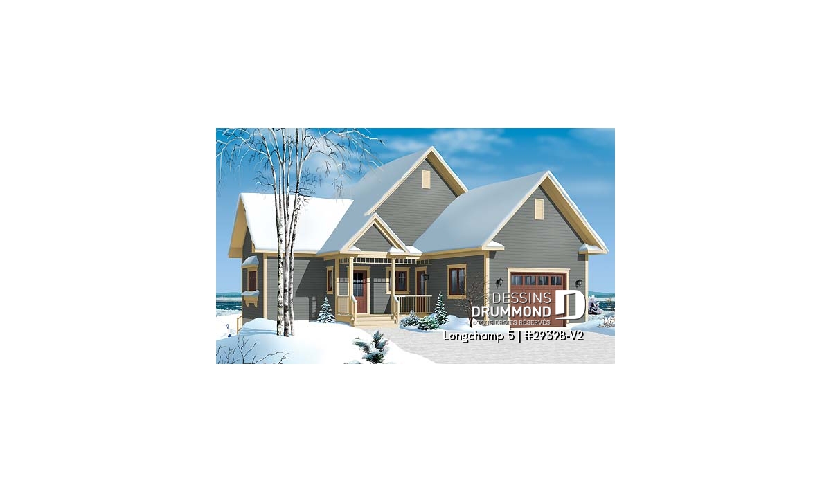 Conçu initialement sous le numéro de plan 2939, ce dernier s’est vu offrir différents modèles versions comme le 2939A, proposant ce même plan de façon inversée ou le 2939B avec coin buanderie prévu au rez-de-chaussée, sans oublier le 2939B-V1 pour lequel l’étage est éliminé et le sous-sol aménagé. Par contre, aucun d’entre eux ne suggérait un garage attaché et c’est pourquoi Dessins Drummond se fait un plaisir de vous offrir ce 2939B-V2.