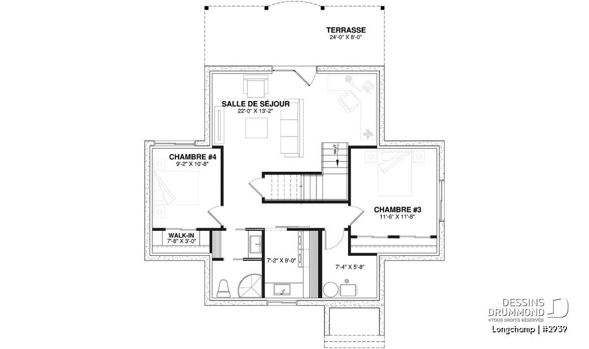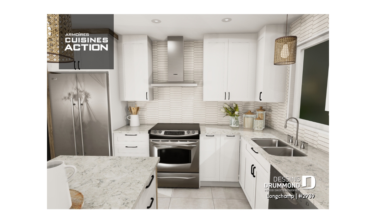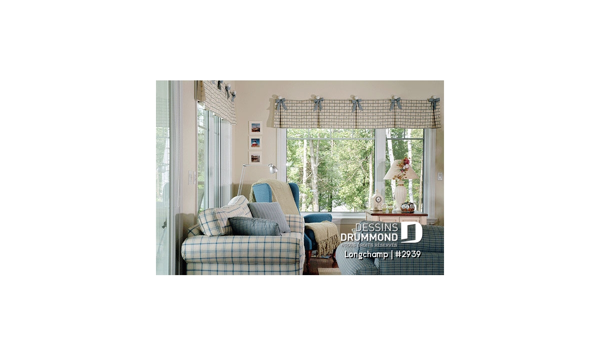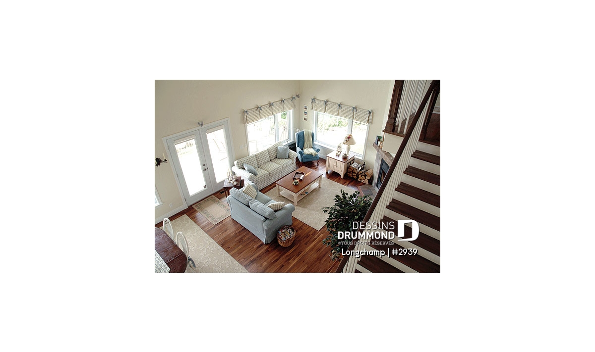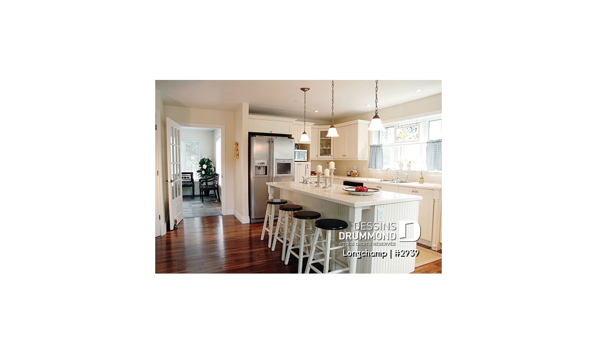 À l’intérieur, que l’on soit dans la cuisine, la salle à manger, la salle de séjour ou la chambre des maîtres, on peut facilement observer ce panorama de tout le rez-de-chaussée. Ce sont là de bien beaux espaces intérieurs et tous offrent une particularité. Cuisine attrayante avec îlot central, fenestration abondante et foyer mitoyen à la salle de séjour et la salle à manger, belle chambre des maîtres avec grande garde-robe et accès discret à une salle de bain complète.