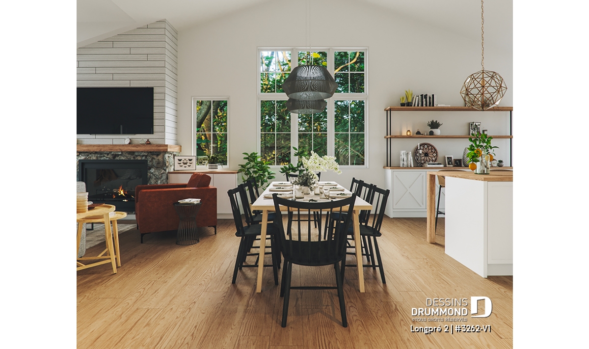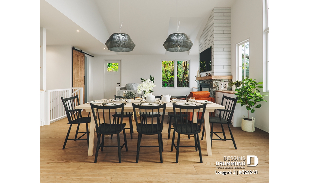 Dès l’entrée, on découvre une aire ouverte lumineuse où la cuisine, la salle à manger et le salon se rencontrent sous un magnifique plafond cathédrale. Cet espace central, baigné de lumière naturelle, devient immédiatement le cœur chaleureux de la maison. La salle à manger, stratégiquement placée, profite d’une abondance de fenestration qui crée une ambiance conviviale et accueillante.