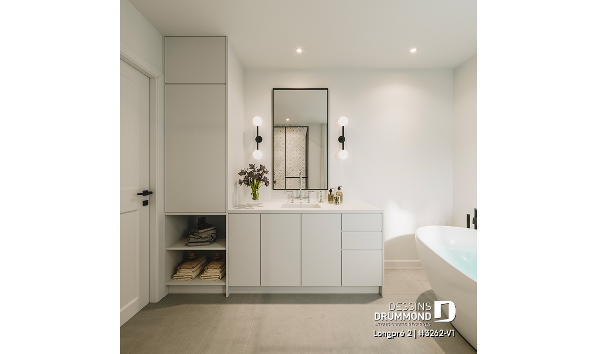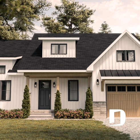 Le superbe plain-pied de style Farmhouse LONGPRÉ 2 (3262-V1) séduit au premier regard avec son garage intégré et son vaste perron avant abrité, parfait pour accueillir vos invités ou profiter des saisons québécoises à l’abri. L’entrée par le garage se distingue par un vestiaire pratique avec banquette intégrée, pensé pour faciliter la vie de famille au quotidien et garder la maison bien organisée.