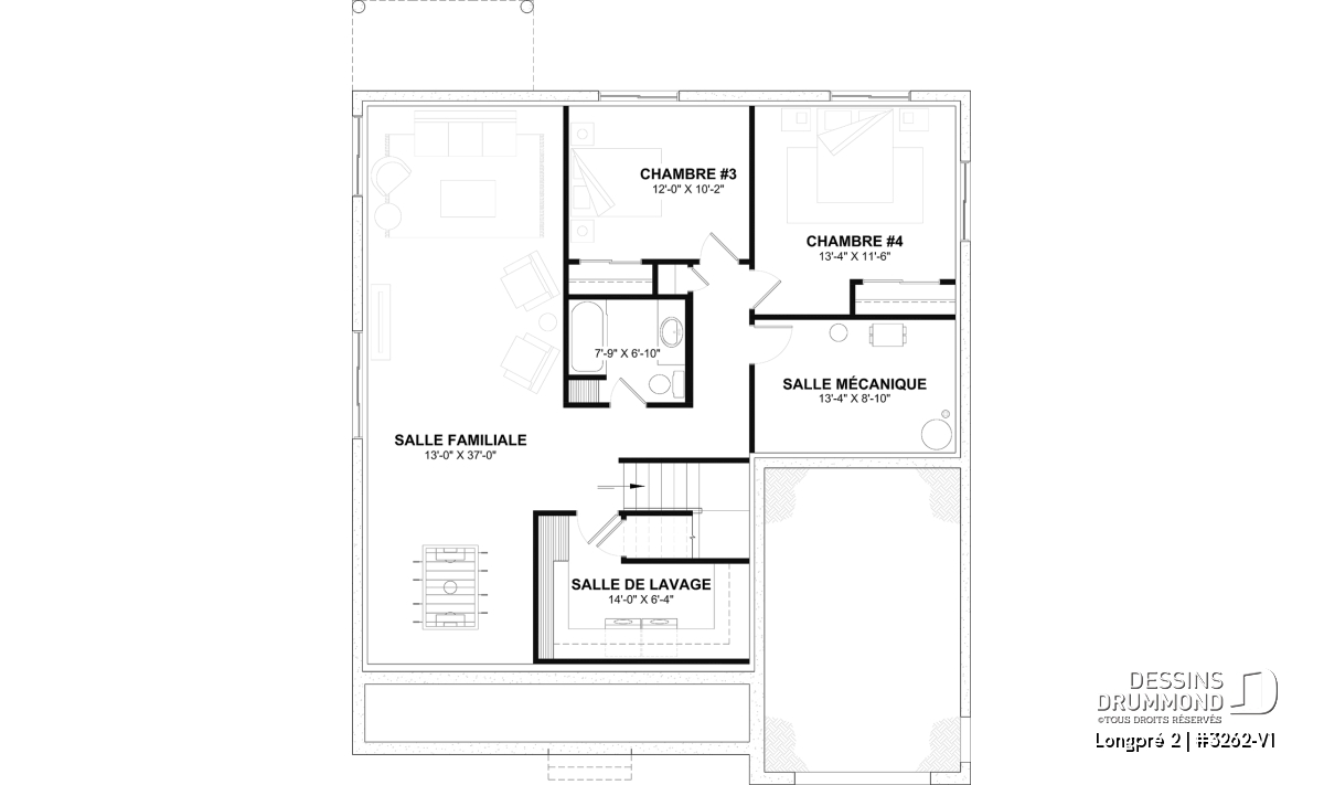 *Si vous souhaitez acheter le plan du sous-sol aménagé, tel que présenté sur la page de ce plan, veuillez sélectionner cette option dans le panier d'achat, dans la section "Sélectionner votre fondation". Si vous ne sélectionnez pas cette option, vous recevrez le sous-sol non fini, sans frais additionnel.