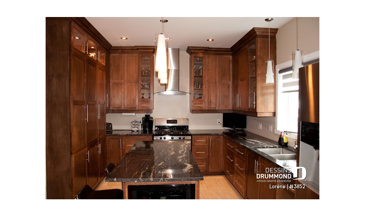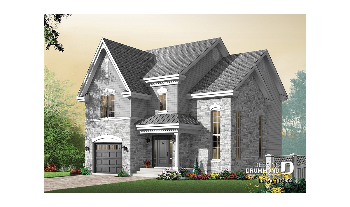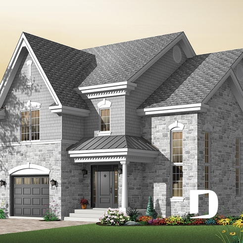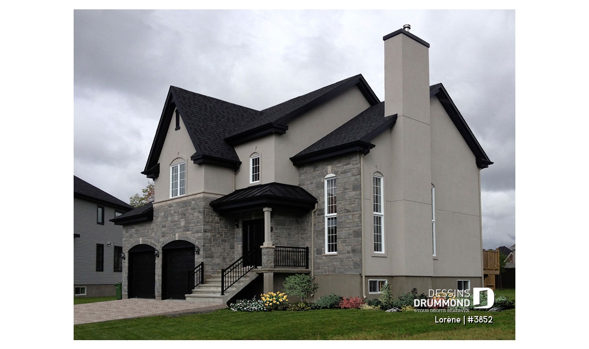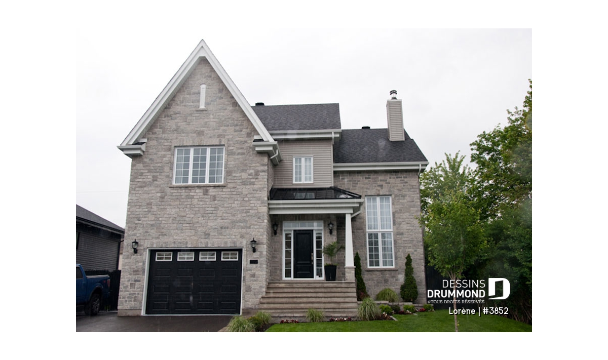 Dans un esprit manoir, avec lignes extérieures simplifiées, usage de matériaux distincts et moulures relevées à des endroits stratégiques, cette résidence se veut définitivement originale. La présence de fenêtres allongées, sur le coin droit de la maison, trahie la hauteur de dégagement de plafond attribuée à la pièce y étant aménagée.