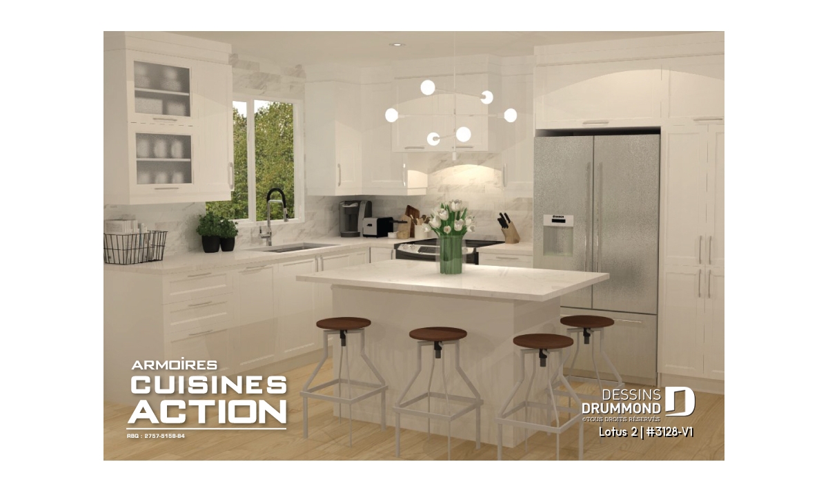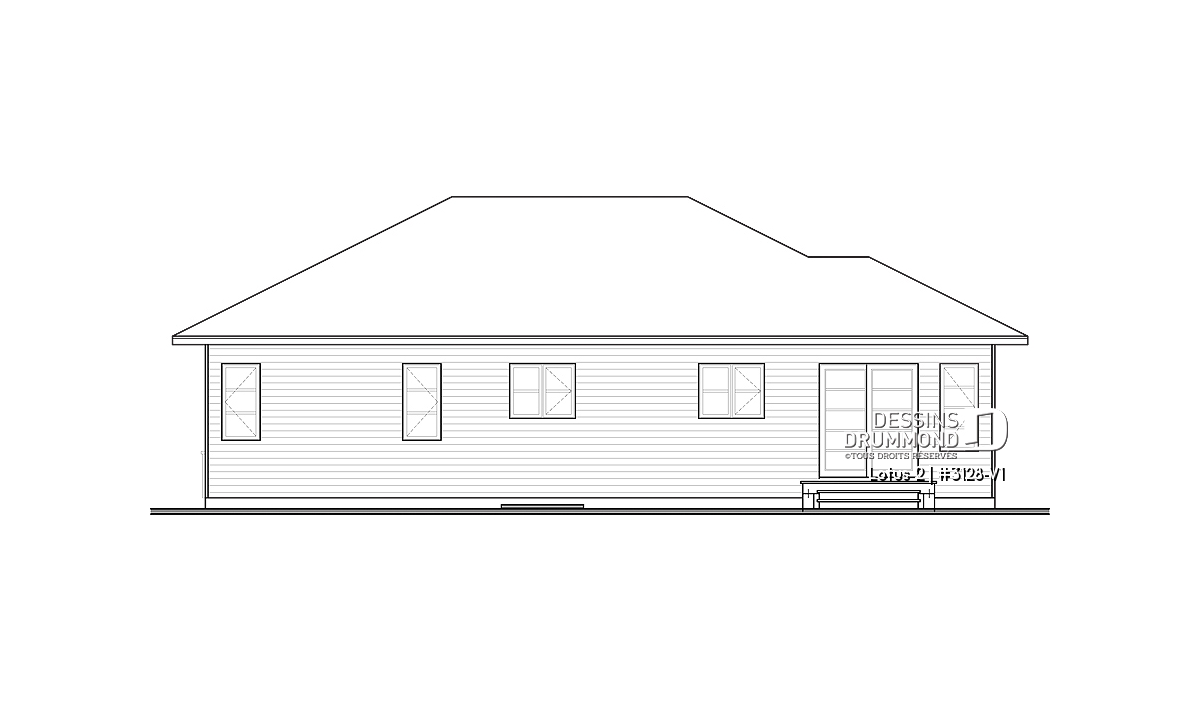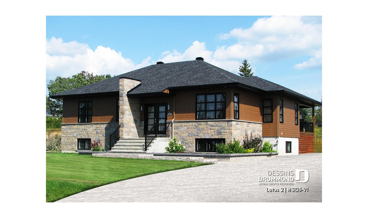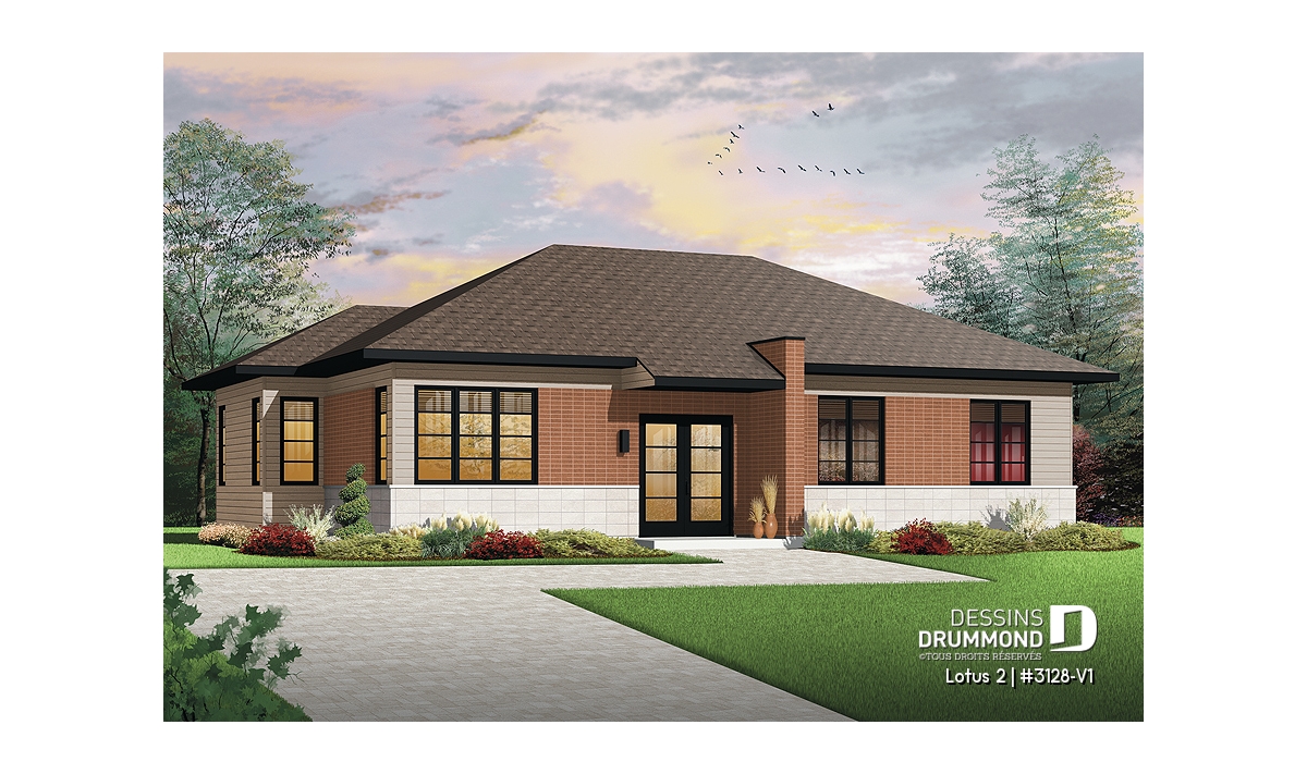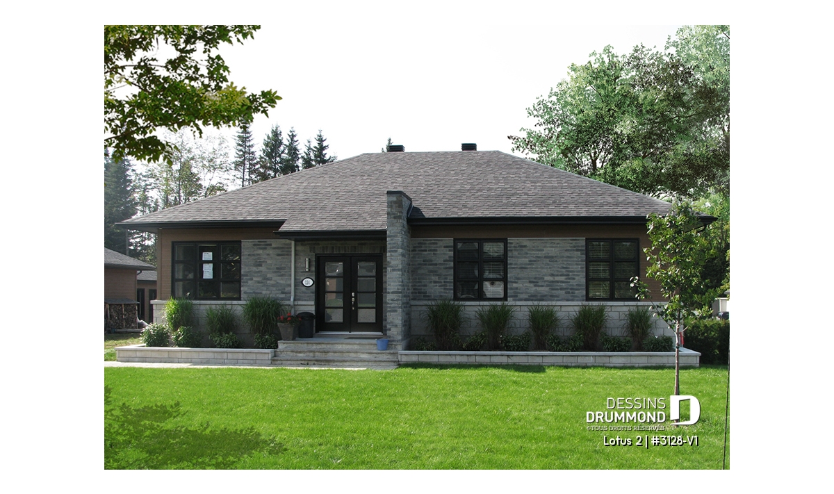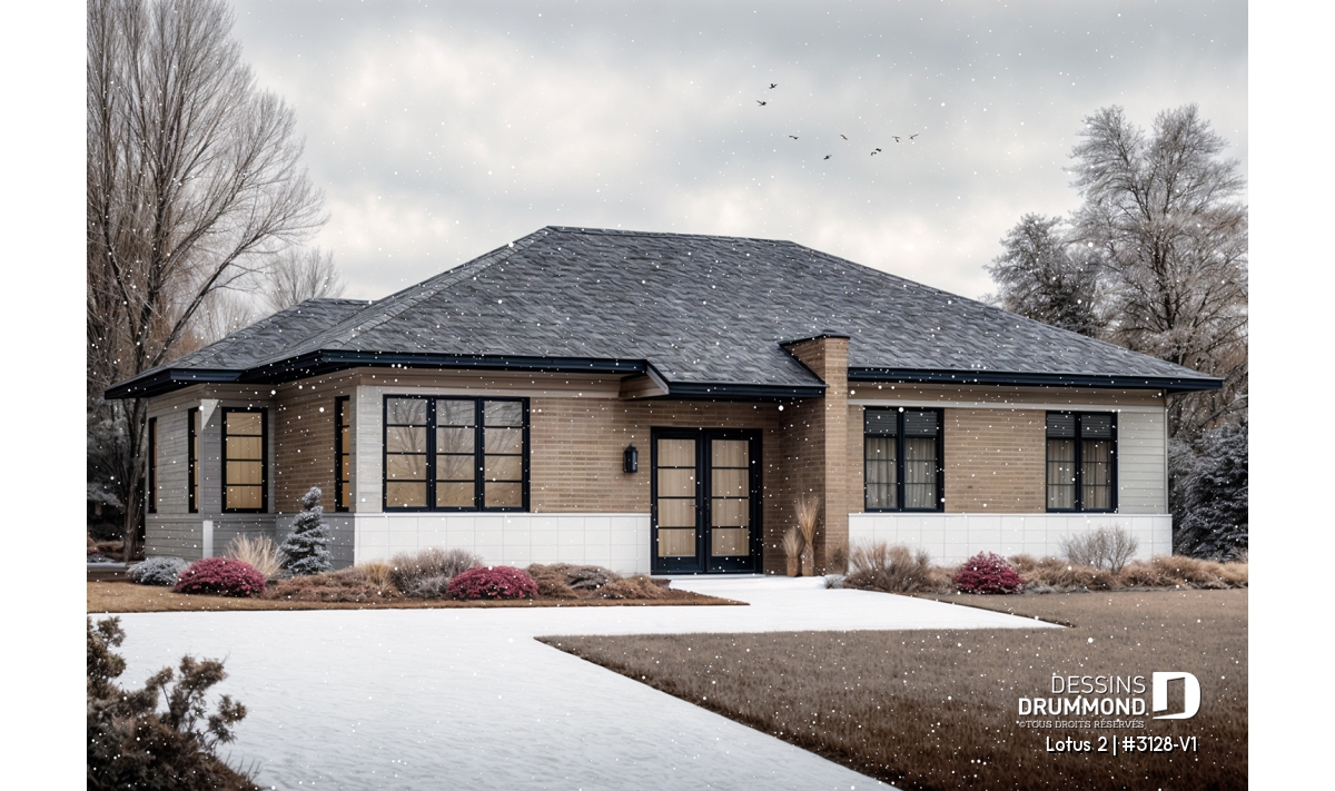 Conçu à partir du plan de plain-pied contemporain 3128 qui fit un malheur dès son arrivée sur le marché du plan standard en 2011, ce plan version se veut encore plus logeable avec cet agrandissement de 8 pi en largeur permettant l’addition d’une troisième chambre au rez-de-chaussée ainsi qu’un gain d’espace appréciable rattaché à quelques pièces de ce plancher.