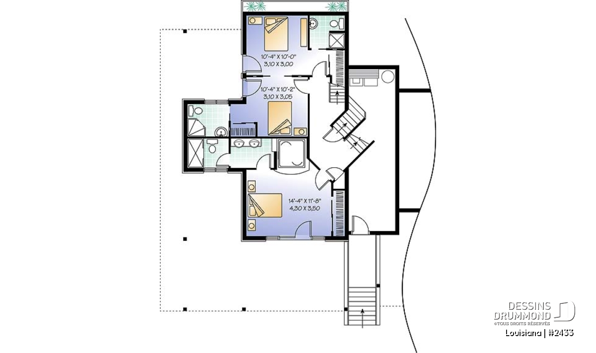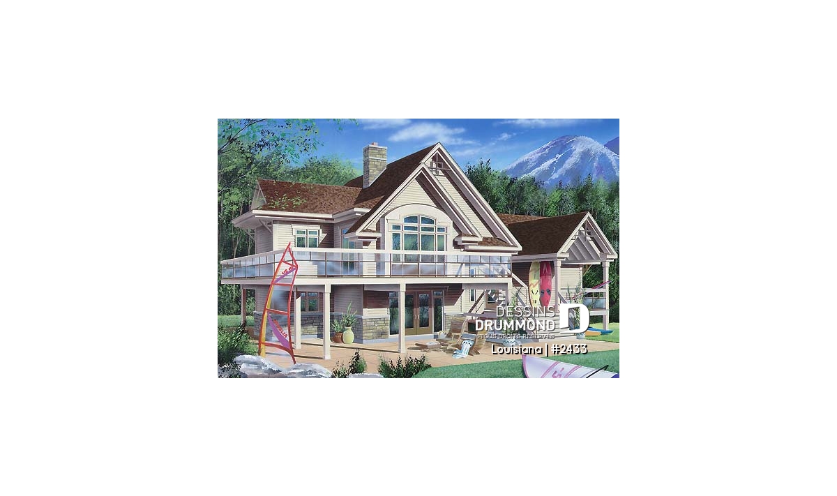 Étage - Plan de chalet 3 chambres, 3.5 salles de bain, aire ouverte, 2 salons, foyer central, grande terrass - Louisiana