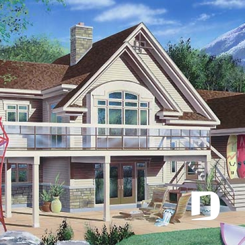 Plan de chalet 3 chambres, 3.5 salles de bain, aire ouverte, 2 salons, foyer central, grande terrass