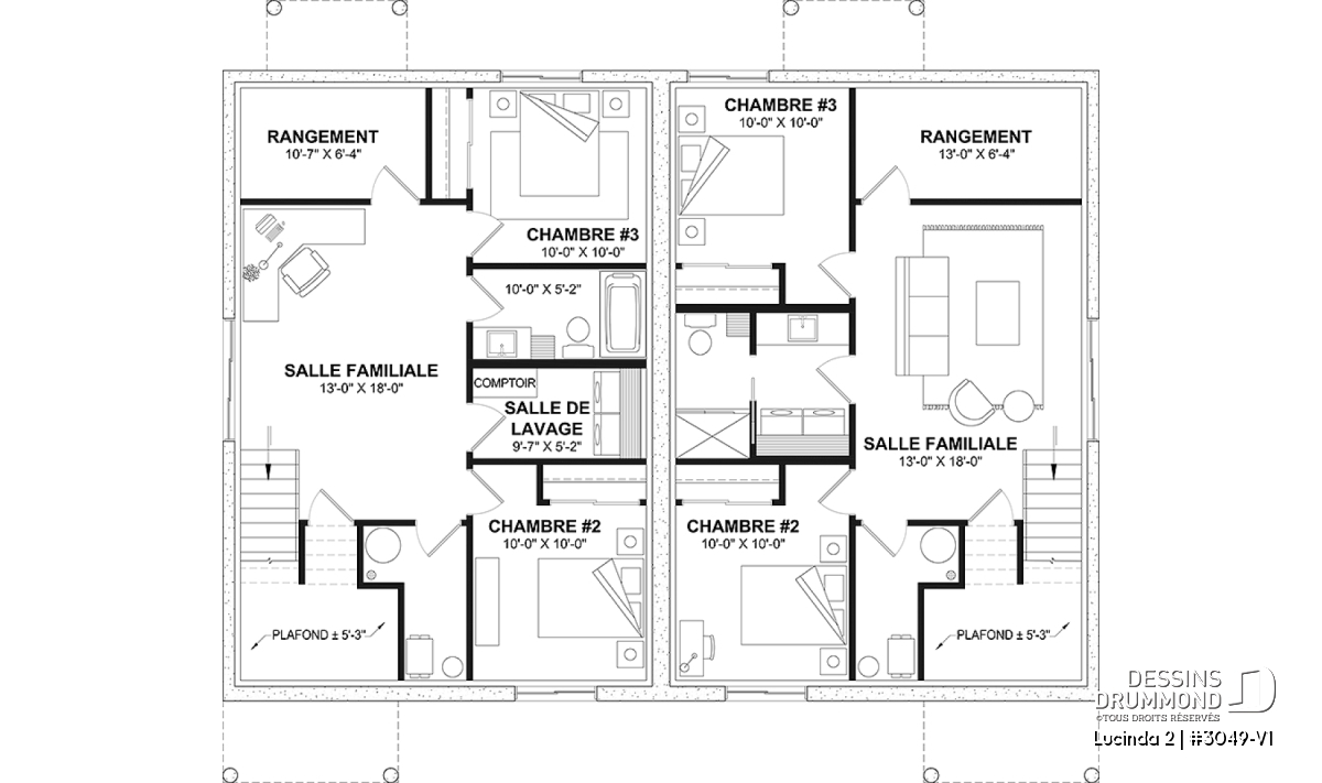 Au, sous-sol, on retrouve, pour chaque unité, deux belles chambres secondaires avec garde-robes fort logeables et espace permettant d’aménager un lit double, une salle de jeux avec bel éclairage naturel et un espace rangement. Alors que dans l’unité de gauche on remarque un espace buanderie indépendant de la salle de bain, l’unité de droite propose pour sa part une buanderie jumelée à une salle de douche stratégiquement aménagée. À noter que les aménagements peuvent être inter-changés selon vos préférences. Donc, à vous de choisir !