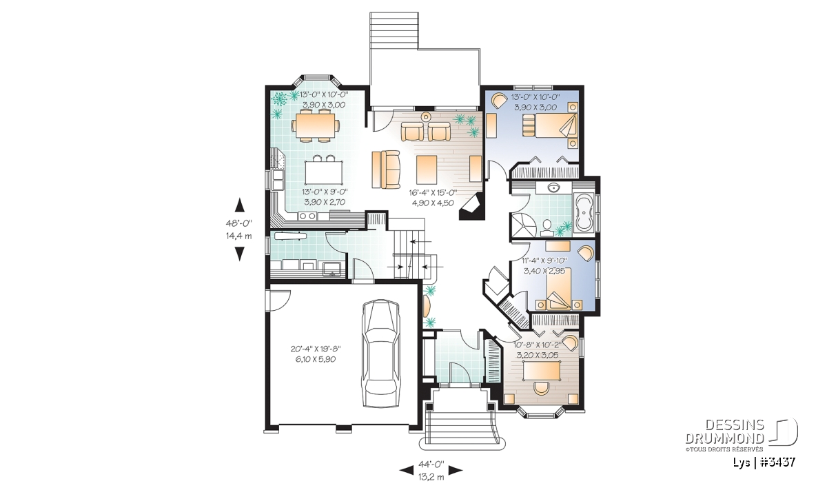 Avec sa façade de 44 pieds le largeur et son organisation à paliers pour le garage et la chambre 1, cette maison bénéficie de fondations simplifiées et par conséquent de coûts moins élevés de construction.