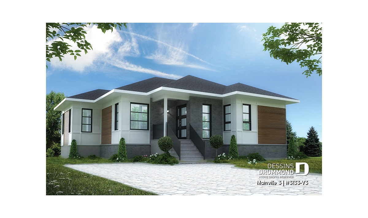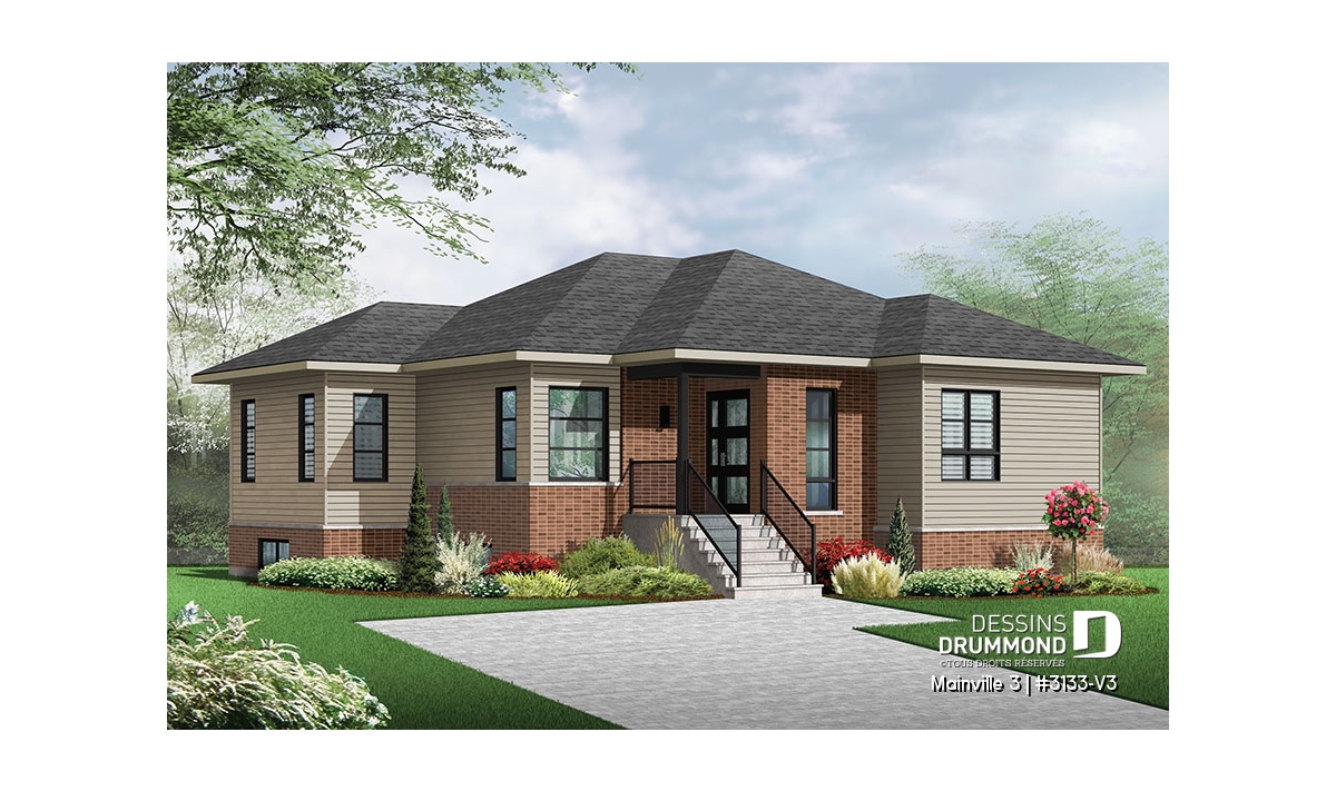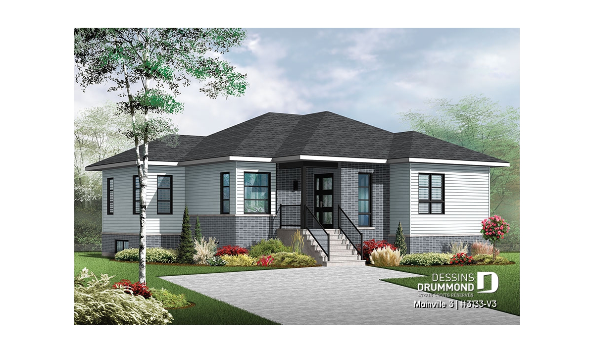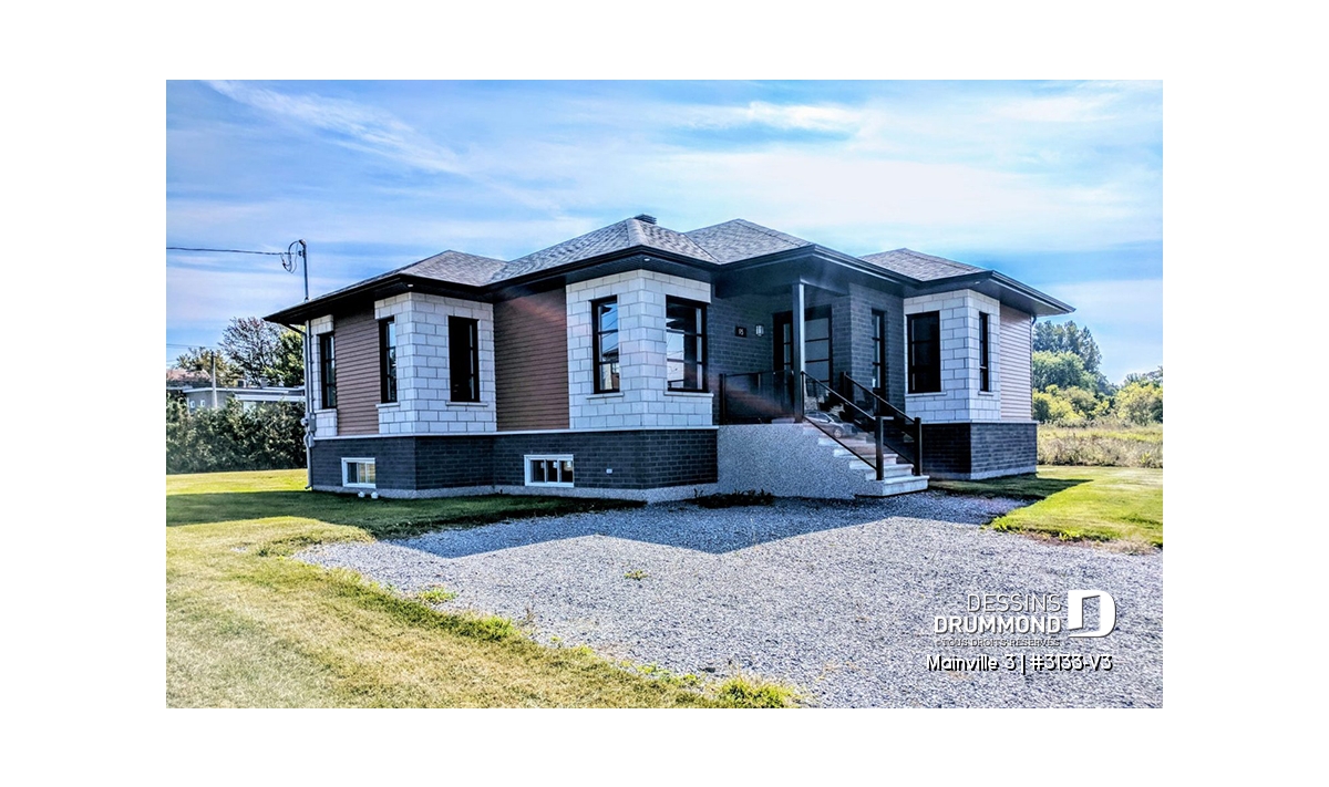 Conçu à partir du très populaire plan 3133, ce modèle version, d’approche contemporaine, se veut davantage confortable avec un peu plus de 45pi2 additionnels au rez-de-chaussée et, par le fait même, à ce sous-sol agrandi et avantageusement sorti du sol pour l’obtention d’un bon éclairage naturel.