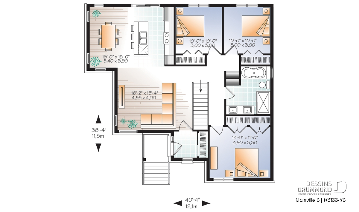 À l’instar du plan original, ce plan 3133-V3 propose un aménagement intérieur comprenant un vestibule avec garde-robe fort logeable, un secteur activités entièrement ouvert et regroupant une salle de séjour et une salle à manger tout en lumière ainsi qu’une cuisine/dînette de type laboratoire avec îlot central imposant de 3pi de largeur par 7pi de longueur comme tant prisé par les propriétaires. À cela s’ajoute trois chambres de bon format dont une chambre des maîtres à 13pi x 11p et deux chambres secondaires de 10pi x 10pi dotées chacune d’une garde-robe de plus de 6pi de longueur. Sans oublier, une salle de bain fort bien aménagée avec vanité double, espace pour bain de 6pi si désiré et douche indépendante de 3pi x 5pi.
